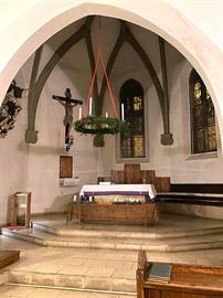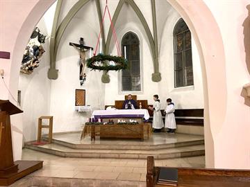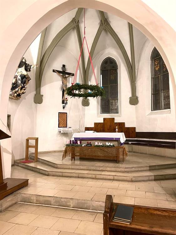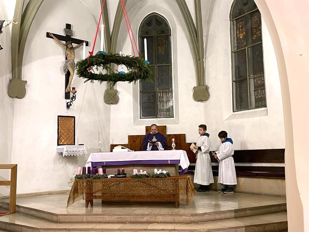 Ani ve filiálním kostele sv. Máří Magdaleny nemohl letos chybět zavěšený adventní věnec. Požehnal jej českolipský děkan J.M. can. Mgr. Viliam Matějka. Neděle 27. listopadu 2022, kostel sv. Maří Magdalény, Česká Lípa