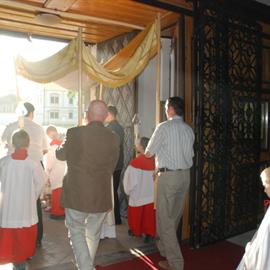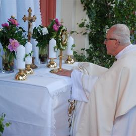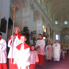 slavnost Těla a krve Páně (Boží tělo), hlavní celebrant mše svaté litoměřický biskup Jan Baxant, koncelebrovali probošt svatoštěpánské kapituly Jiří Hladík O.Cr. a kapitulní kanovníci Józef szeliga a Martin Davídek, 4. června 2015, katedrála sv. Štěpána, areál Dómského náměstí, Litoměřice