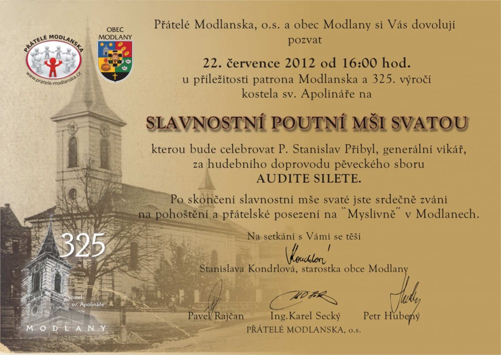 Farnost Modlany si letos připomíná 325. výročí od zahájení výstavby kostela sv. Apolináře. Poutní slavnost a zároveň připomenutí tohoto výročí se tu bude konat v neděli 22. července 2012. Mši svatou zde bude od 16 hodin sloužit generální vikář litoměřické diecéze P. Stanislav Přibyl CSsR.