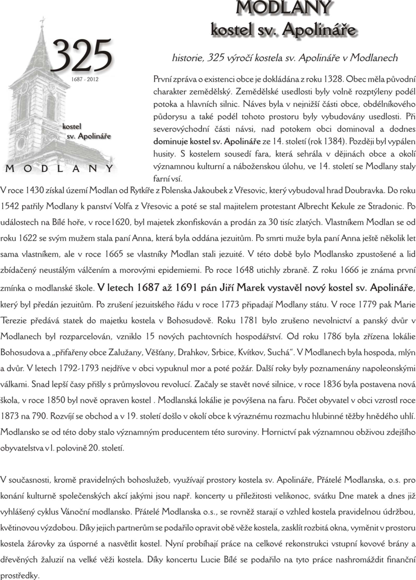 Pozvánka a historie kostela na www.obecmodlany.cz.