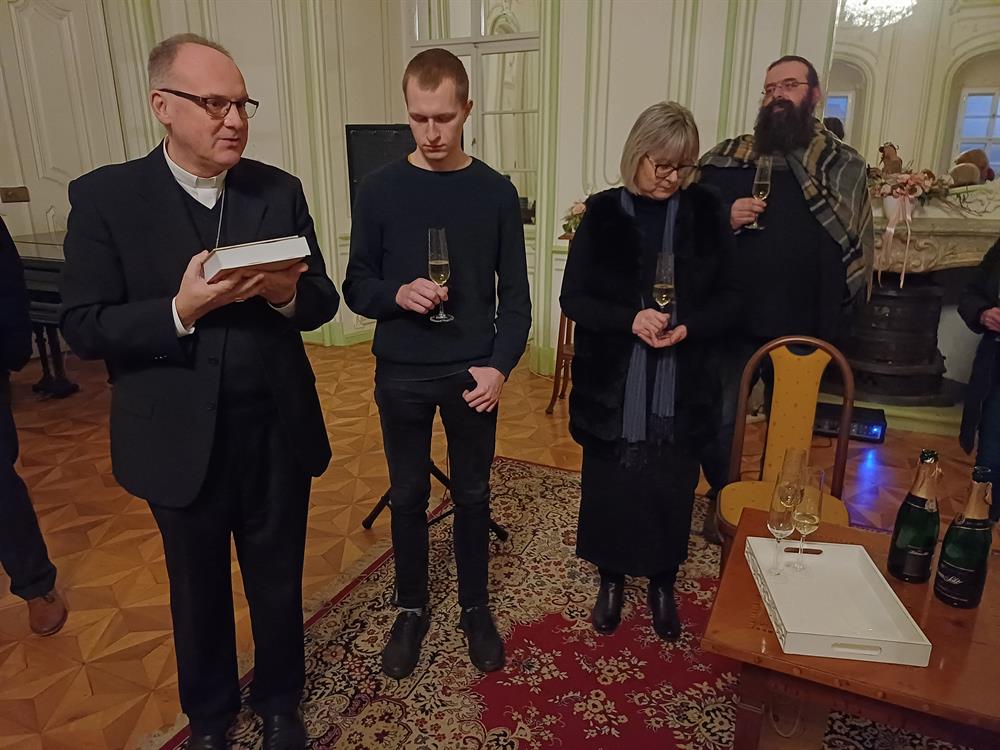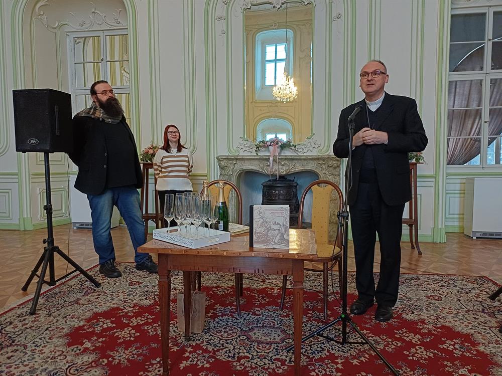 Biskup poděkoval autorovi. "Nepotkáváme se poprvé. Viděli jsme se v Oseku, ale to jste nebyl takhle čistý, ale celý uprášený ze zevrubného průzkumu knihovny," podotkl biskup a práci Jiřího Wolfa ocenil.