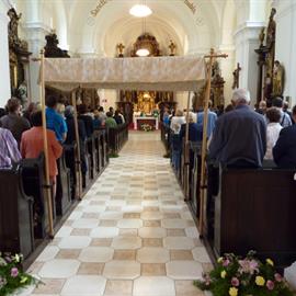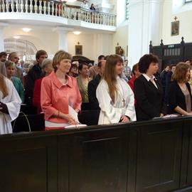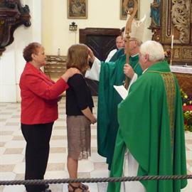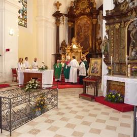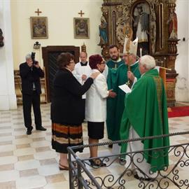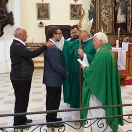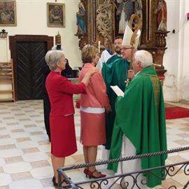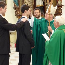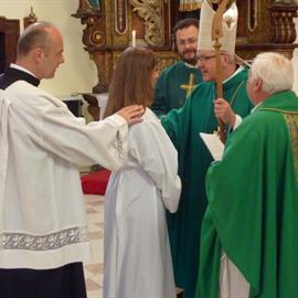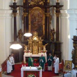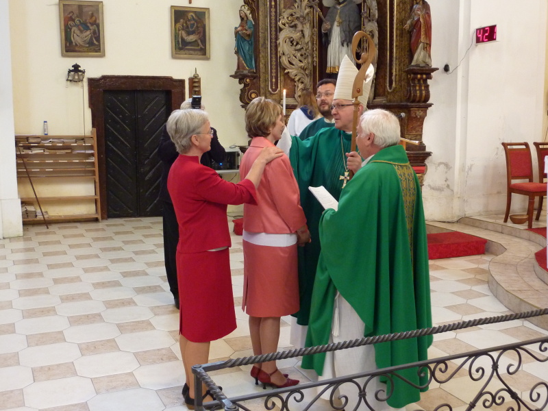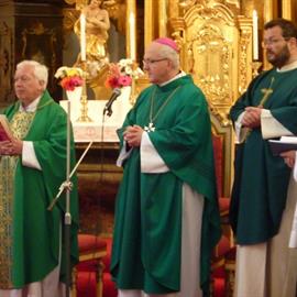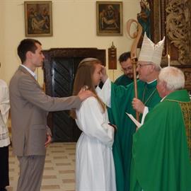 biřmování, litoměřický biskup Mons. Jan Baxant, děkan farnosti Aleksander Siudzik a R.D. Josef Hurt, 9. června 2013, kostel sv. Petra a Pavla, Podbořany