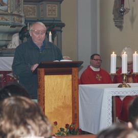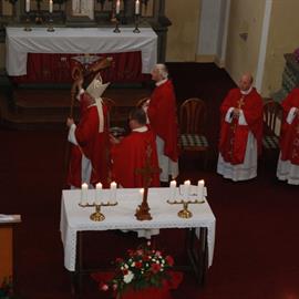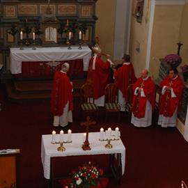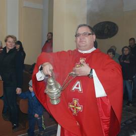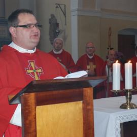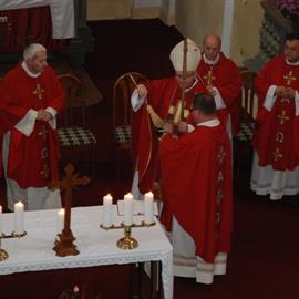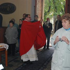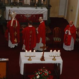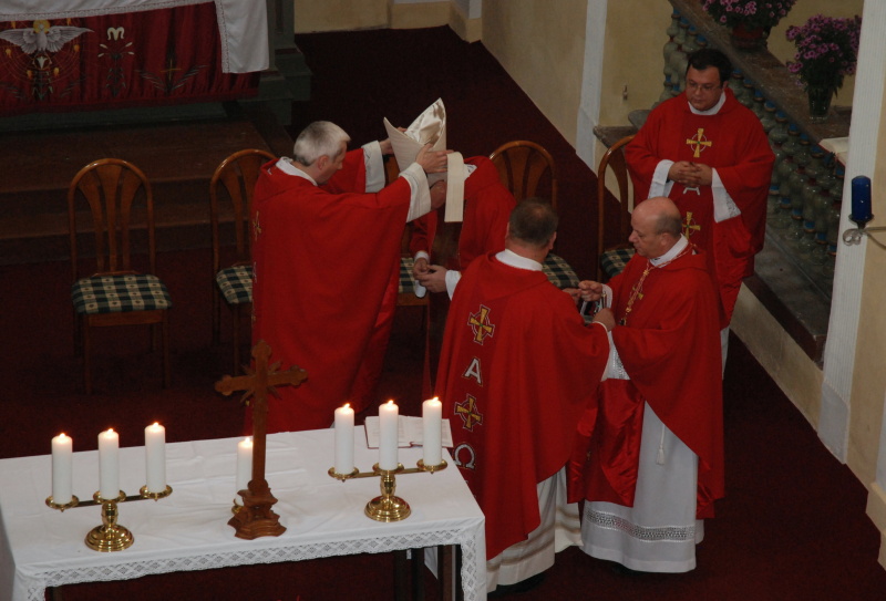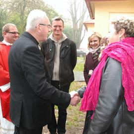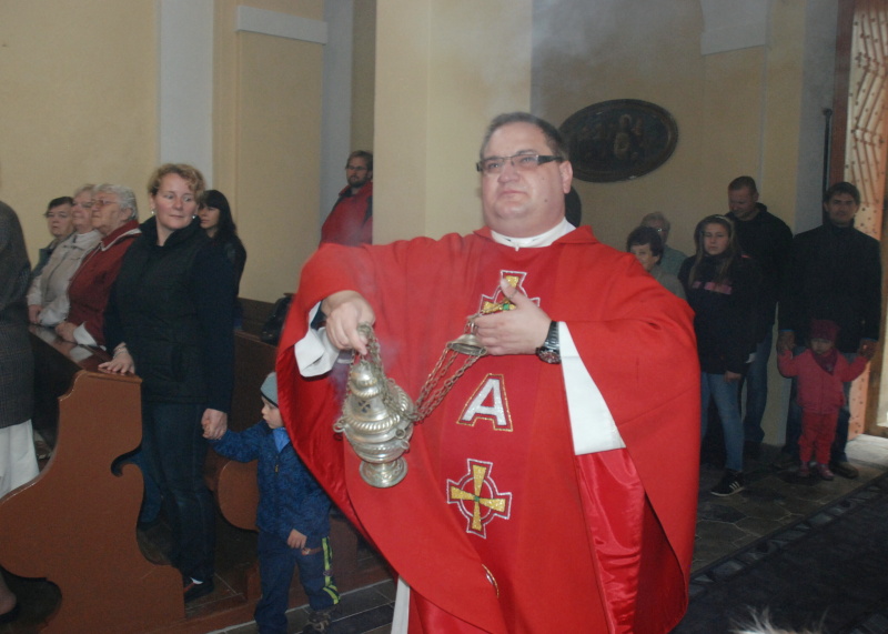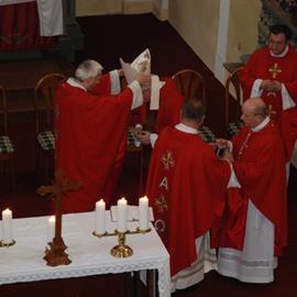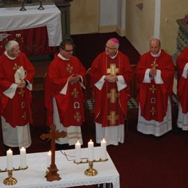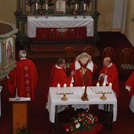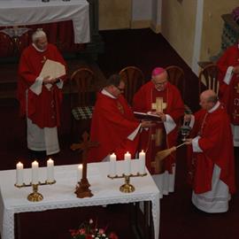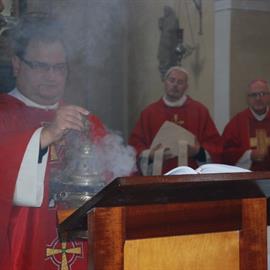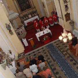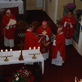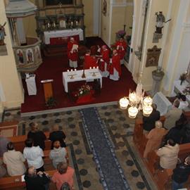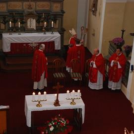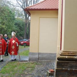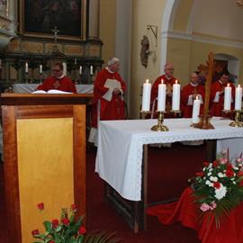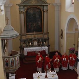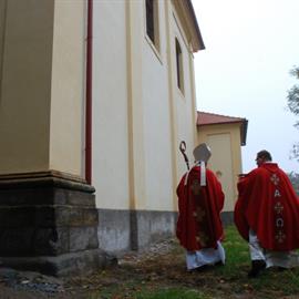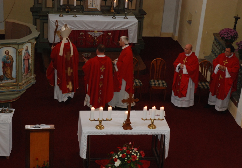 mše svatá s žehnáním opraveného kostela, hlavní celebrant mše svaté litoměřický biskup Mons. Jan Baxant, koncelebrovali administrátor exc. in spiritualibus Římskokatolické farnosti v Dlažkovicích R.D. Tomasz Dziedzic, děkan Římskokatolické farnosti - děkanství u Všech Svatých v Litoměřicích a okrskový vikář J.M. can. Józef Szeliga, administrátor Římskokatolické farnosti v Budyni nad Ohří R.D. Mikuláš Uličný a P. Rodryg Albin z diecéze Legnica (Polsko), 12. října 2013, kostel sv. Václava, Dlažkovice