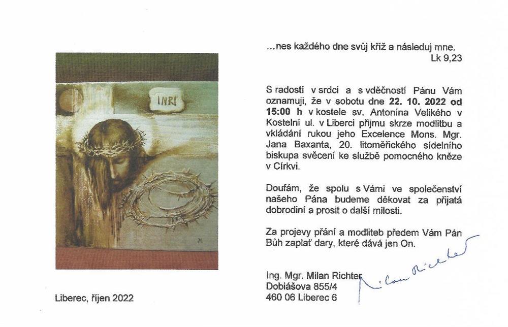 Skrze modlitbu a vkládání rukou biskupa Jana Baxanta přijal v sobotu 22. října 2022 kněžské svěcení jáhen Milan Richter. Slavnost, které se zúčastnilo množství duchovních představitelů, přátel a rodiny, se konala v kostele sv. Antonína Velikého v Liberci a společenství kněží působících v litoměřické diecézi se tak rozrostlo o nového kněze. Primiční mši svatou bude sloužit v neděli 30. října tamtéž a kněžskou službu vykonávat v Liberci a okolních farnostech, kde působil jako jáhen.