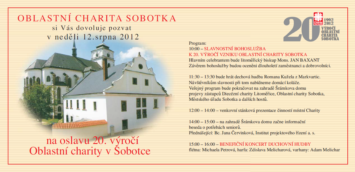 Oblastní charita Sobotka zve všechny své příznivce v neděli 12. srpna 2012 na oslavu 20. výročí svého vzniku. Program bude zahájen v 10.00 hodin slavnostní bohoslužbou v děkanském kostele sv. Maří Magdalské v Sobotce, kterou bude celebrovat litoměřický biskup Jan Baxant.