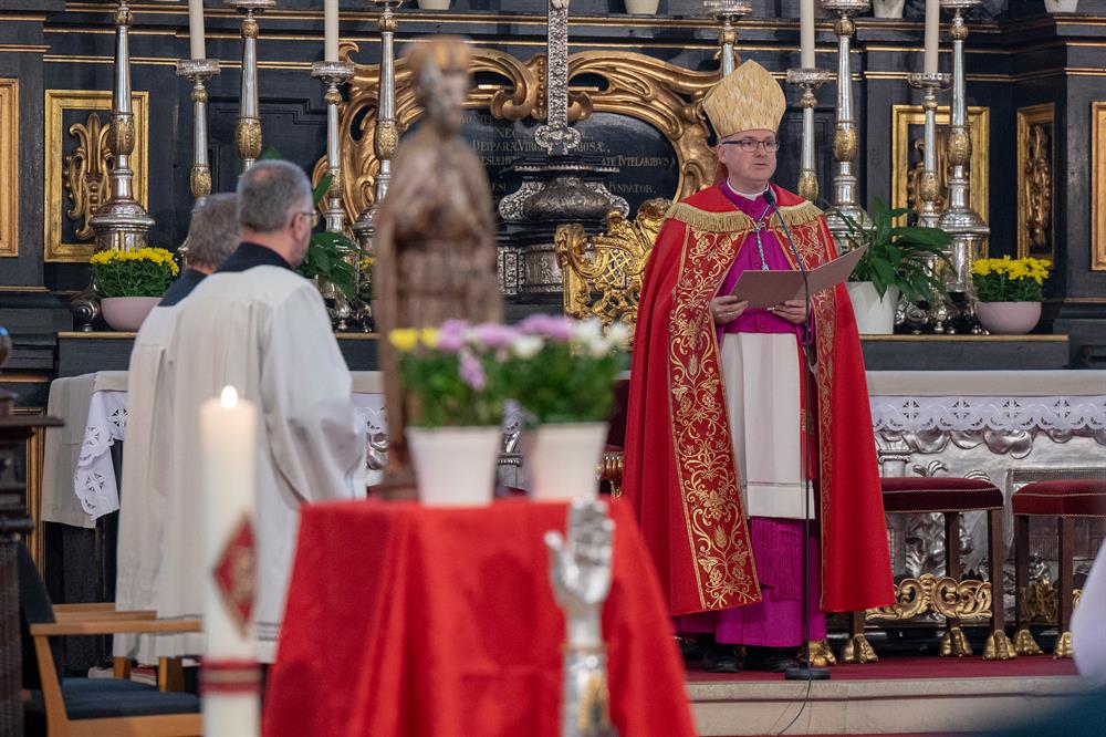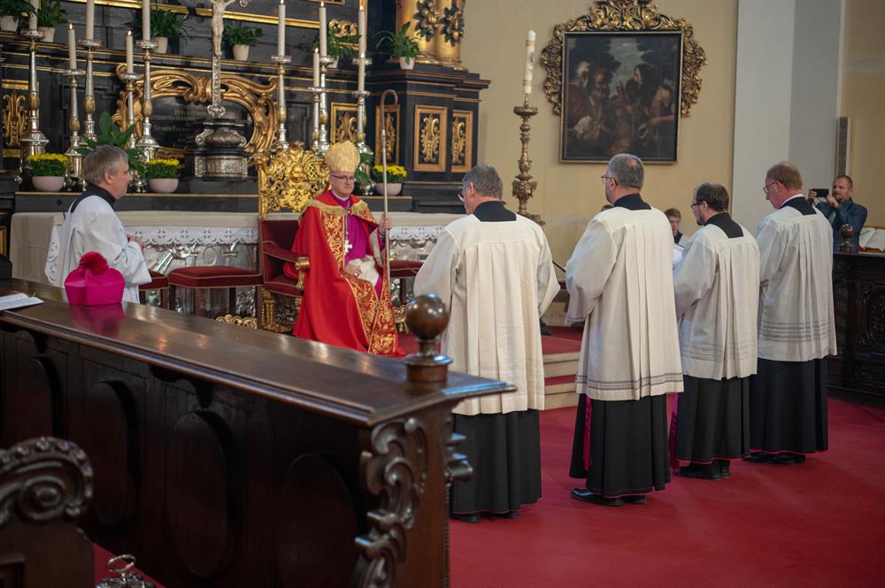 Na úvod přivítal kvarteto kněží, které do kapituly jmenoval. Jsou jimi generální vikář P. Radek Jurnečka, farář z Bělé pod Bezdězem P. Kamil Škoda a dva „sousedé“: P. Holger Kruschina z řezenské diecéze a P. Śćěpan Delan z dřážďansko míšeňské.