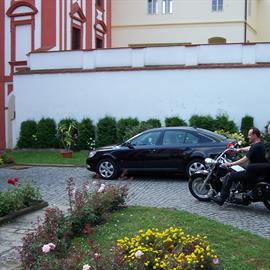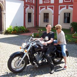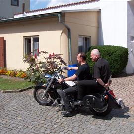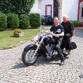 Litoměřický biskup Jan Baxant se ve čtvrtek 13. srpna projížděl po nádvoří biskupské rezidence na motorce. Na chvíli se stal spolujezdcem kněze římskokatolické farnosti z Týna nad Vltavou Marka Donnerstaga, který si přijel do Litoměřic pro biskupské požehnání pro svou Hondu Shadow.