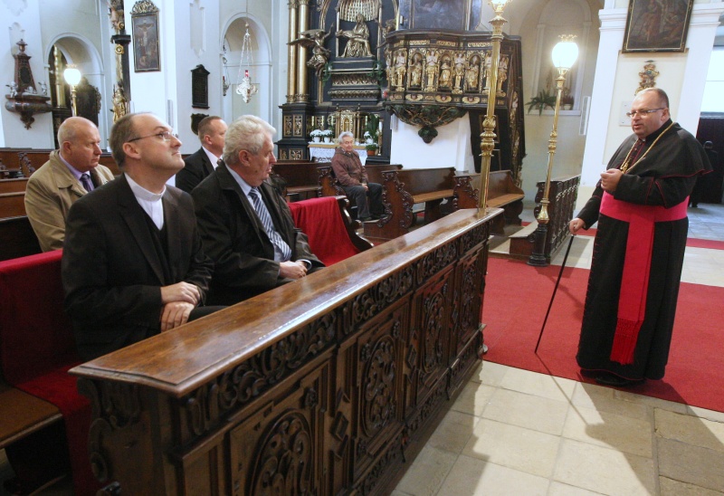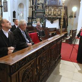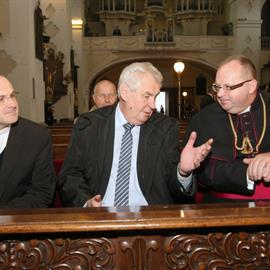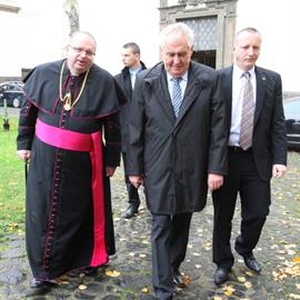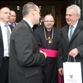 návštěva prezidenta České republiky Miloše Zemana, generální vikář litoměřické diecéze P. Stanislav Přibyl CSsR, probošt litoměřické katedrální kapituly a dómský farář J. M. can. Jiří Hladík O.Cr., 25. října 2013, katedrála sv. Štěpána, Litoměřice