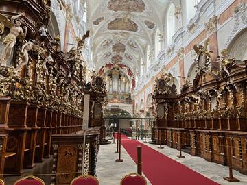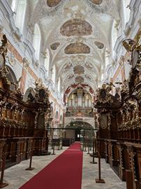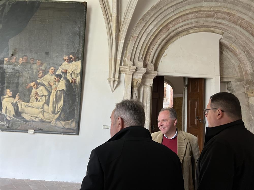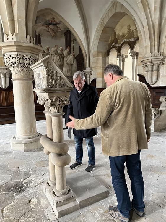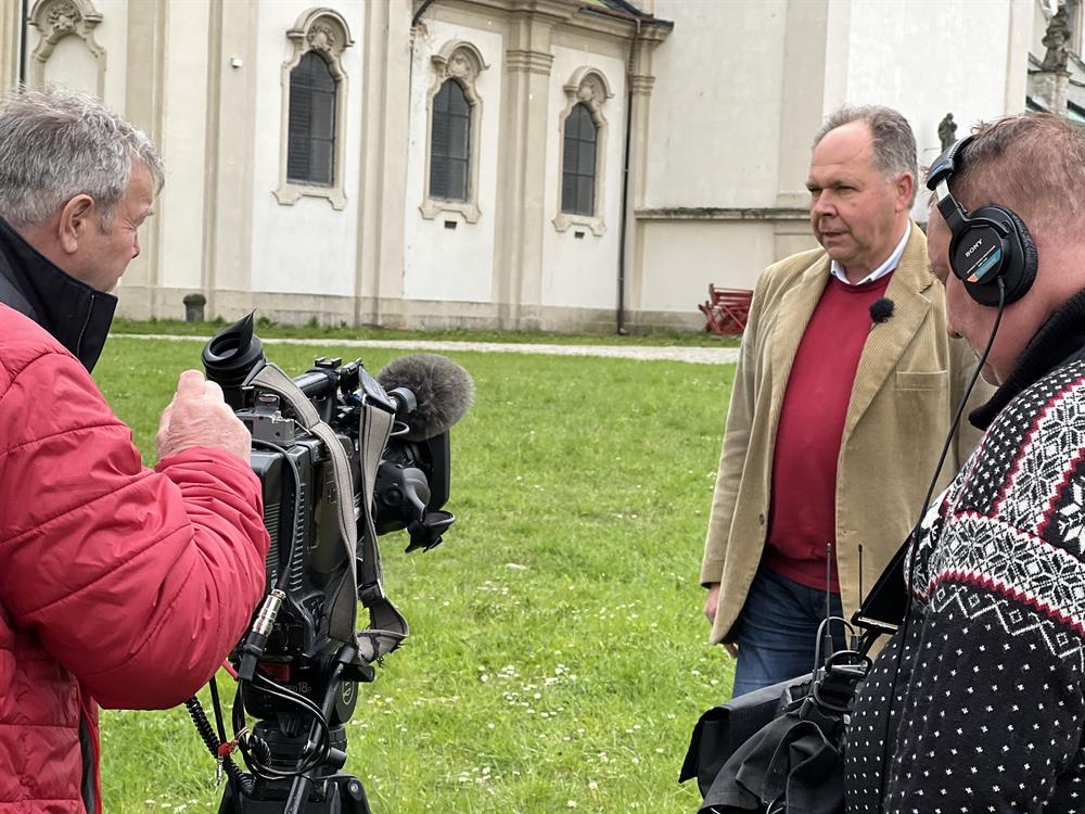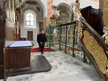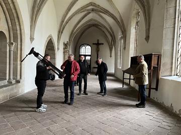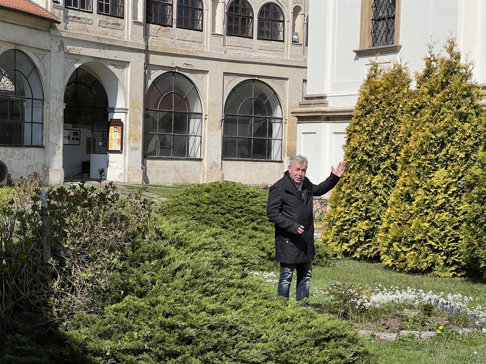 televizi následně provedl klášterem a obnoveným opatským kostelem Nanebevzetí