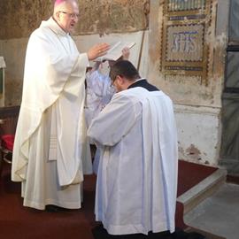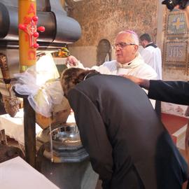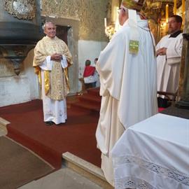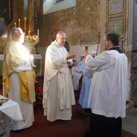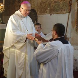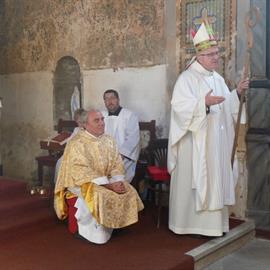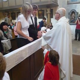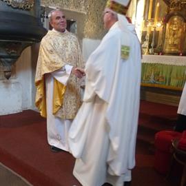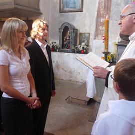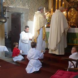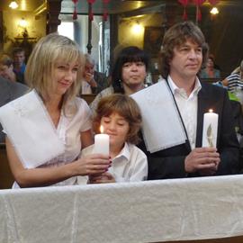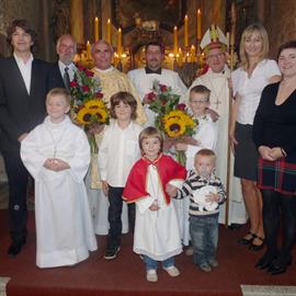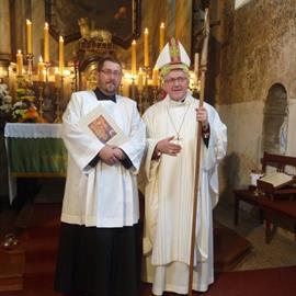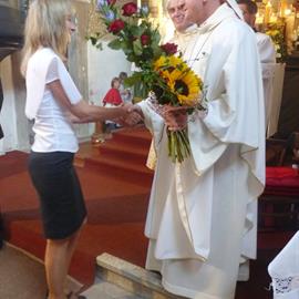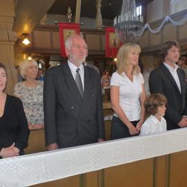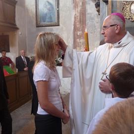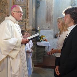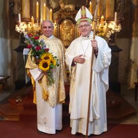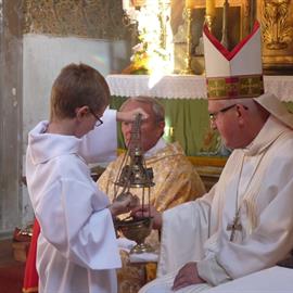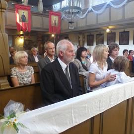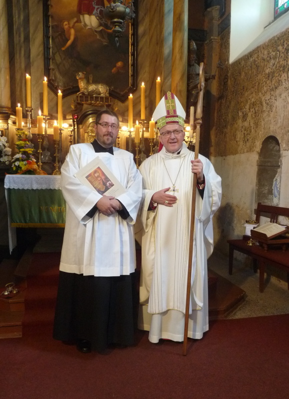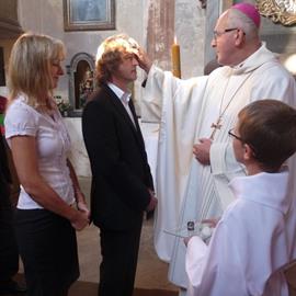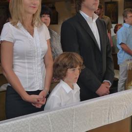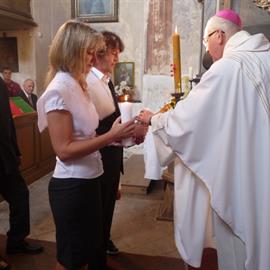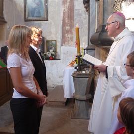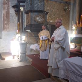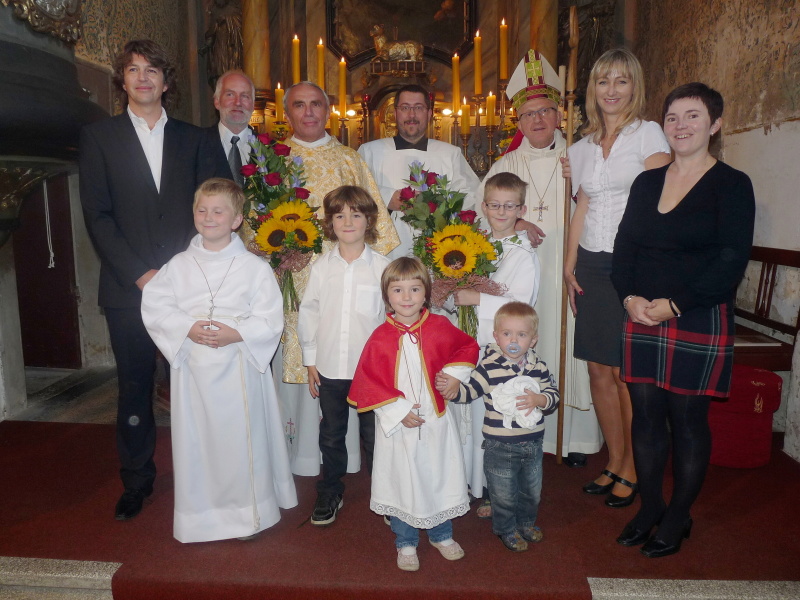návštěva farnosti, mše svatá, hlavní celebrant litoměřický biskup Mons. Jan Baxant, (křest katechumenů, blahopřání administrátorovi exc. in spiritualibus R.D. Josefu Faltejskovi k 65. narozeninám a poděkování za jeho patnáctiletou službu ve farnosti, udělení služby lektora a akolyty administrátorovi in materialibus farnosti Bc. Michalu Olekšákovi), 7. září 2013, kostel sv. Vavřince, Dlouhý Most
