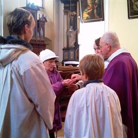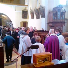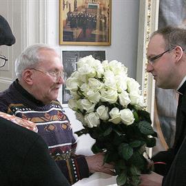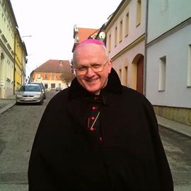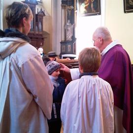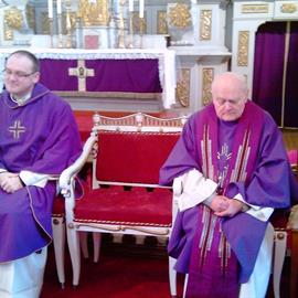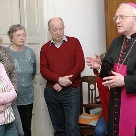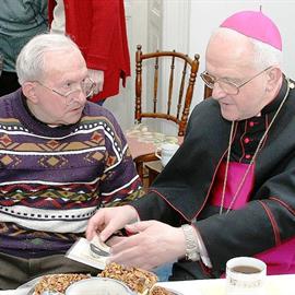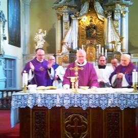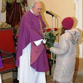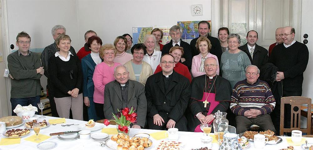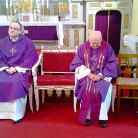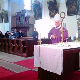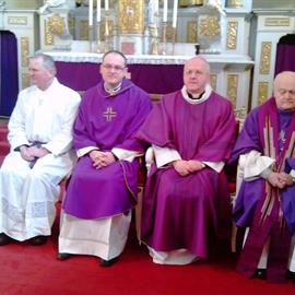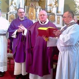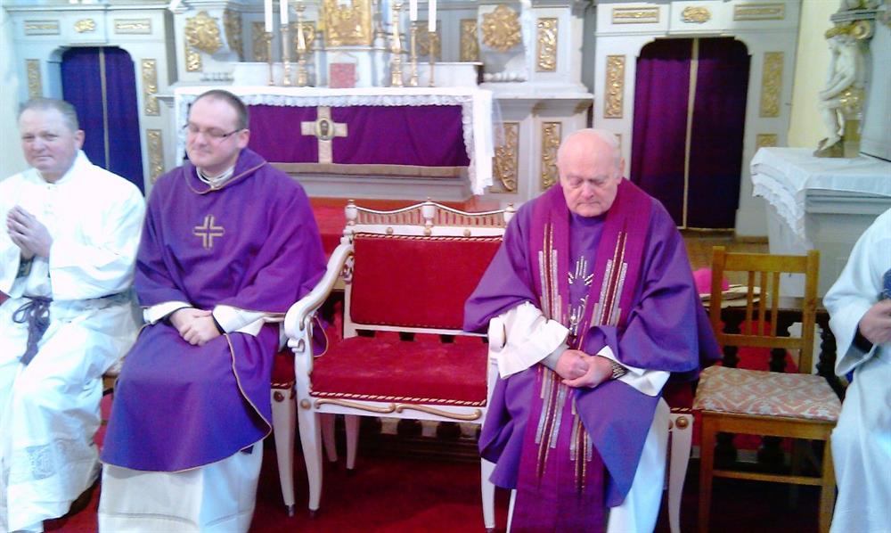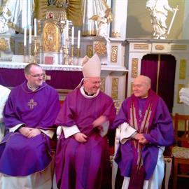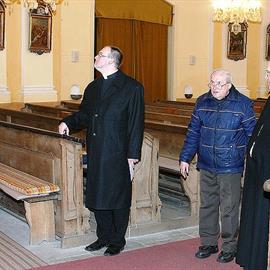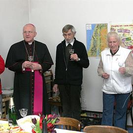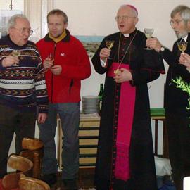 Mons. Jan Baxant poblahopřál kněžím jubilantům Petr Fiala, Martin Flosman, Milan Mordačík 28.února 2010 oslava narozenin P. Dvořáčka a P. Pavlase; Doksy, Nový Bor