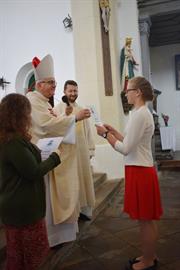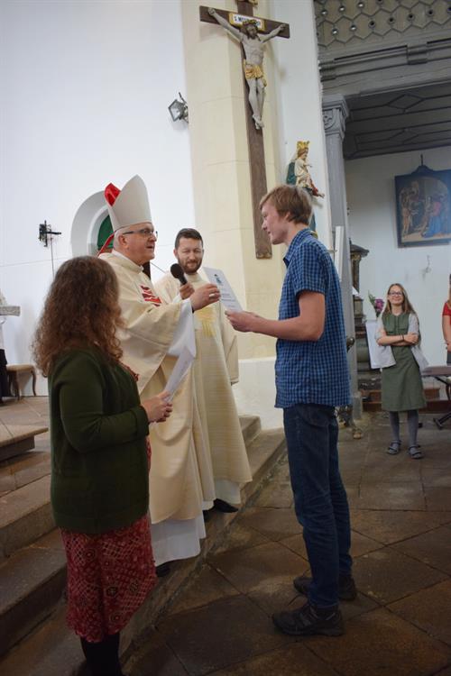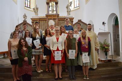 Slavnostní předání osvědčení absolventům dvouletého kurzu animátorů pro práci s mládeží (pořádalo Diecézní centrum pro mládež Litoměřice), litoměřický biskup Jan Baxant, koncelebrantem mše svaté P. Jozef Kadlic – vedoucí DCM, 15. července 2017, kostel sv. Víta, Příchovice