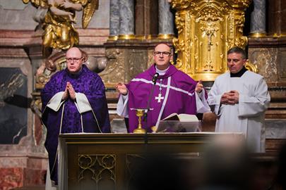 Kázal P. Leo Gallas. „Jedním z úkolů faráře je dávat lidem útěchu, posilu a naději v těžkých chvílích života,“ uvedl kněz. Připomněl, že ve starobylém mosteckém kostele se po celé věky obyvatelé Mostu setkávali v dobách neštěstí, smutku a nebezpečí a společně prosili Boha o ochranu a útěchu. „Bůh nám dal naději, že smrt nemá poslední slovo, že není konečnou stanicí naší životní pouti. A když už se nemůžeme spoléhat na sebe a svou křehkost, můžeme se spolehnout na Boha a jeho milosrdenství. Tomu my křesťané věříme,“ doplnil.