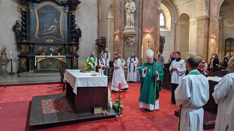 Baxantem v kostele Povýšení svatého Kříže v Děčíně. Biskup zde požehnal všem