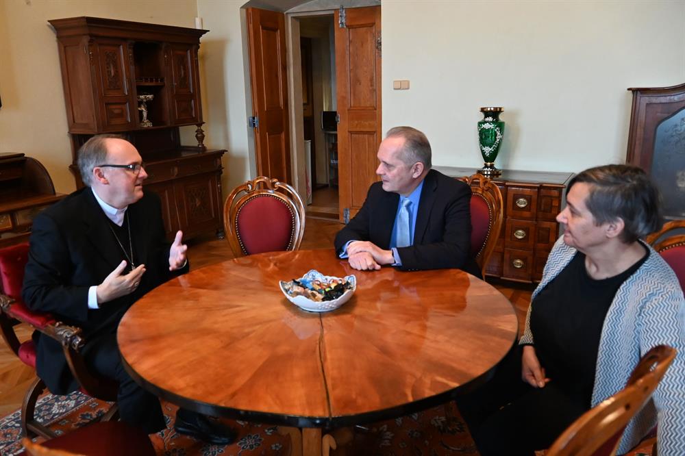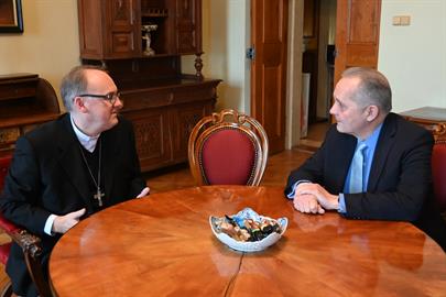 Za biskupem zavítal diplomat společně s kulturní referentkou německého velvyslanectví Katrin Bock. Při setkání probírali možnosti spolupráce v souvislosti s osmdesátým výročím konce druhé světové války. „Hovořili jsme o česko-německém smíření, které nemá být jen připomínáním bolestné historie, ale hlavně má směřovat do budoucnosti,“ shrnul biskup.