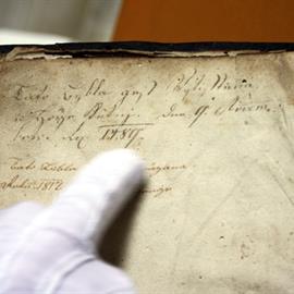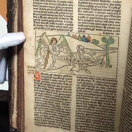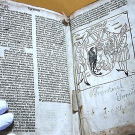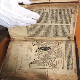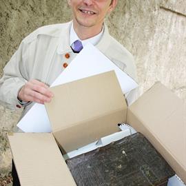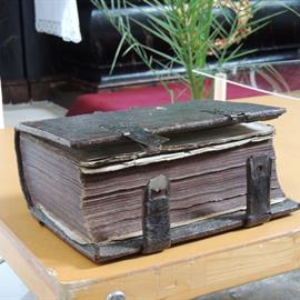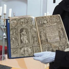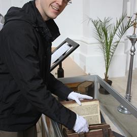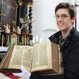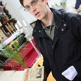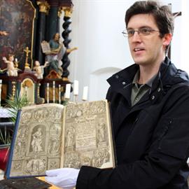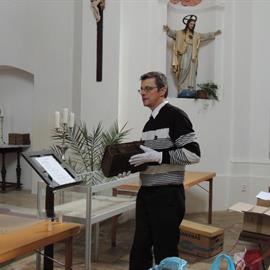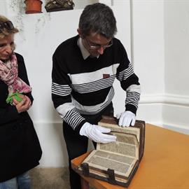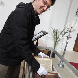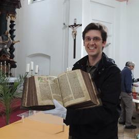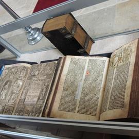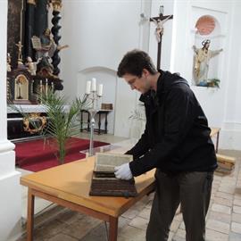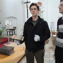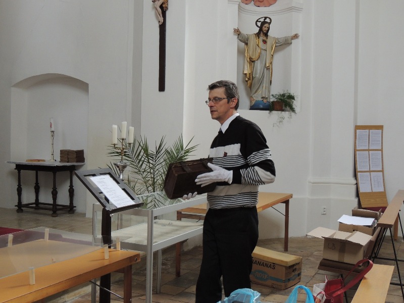 Noc kostelů 2013 v Lounech - příprava výstavy Svobodný hlas (manželé Tošnerovi) a Z. Plachý (Deník) 2.června 2013 Louny, kostel Nejsvětější Trojice a Čtrnácti sv. Pomocníků - výstava Biblí