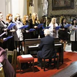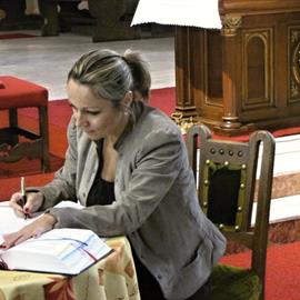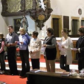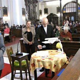kostel sv. Václava, Lovosice. Z programu: kněz Roman Karol Depa a místostarostka města Lovosice Vladimíra Nováková při přepisování Bible, vystoupení sboru ,,BELL CANTO a růženec devíti jazyků.