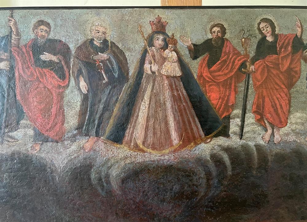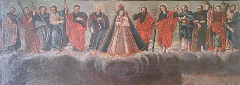 V horní části obrazu, uprostřed řady dvanácti apoštolů s atributy, stojí s Panna Maria s Ježíškem. Jedná se o Pannu Marii Kamenickou, obraz je tak i dokladem jejího lokálního kultu (devoční kopie sošky Panny Marie Kamenické se nacházela např. na tabernáklu hlavního oltáře v kostele v nedalekých Konojedech). Ve střední části obrazu je vyobrazena zvonová stolice se třemi zvony a obětmi neštěstí v různých pozicích.
