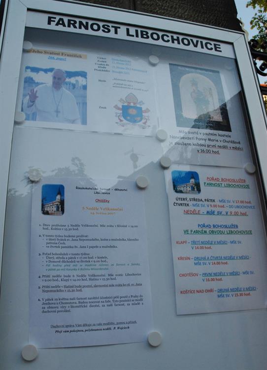 Pěší pouť z Prahy do Jeníkova u Duchcova 17. – 21. května 2017, zastávka v Libochovicích – na pomyslné hranici pražské arcidiecéze a litoměřické diecéze, předání korouhve a kříže, přivítání poutníků při příchodu do města (koláči a chlebem poutníky vítala do litoměřického kroje oblečená Marie Mazancová z Litoměřic, která pouť absolvovala v loňském roce), 19. května 2017, fara a děkanský kostel Všech svatých, Libochovice