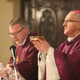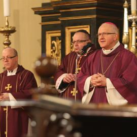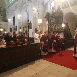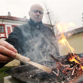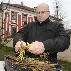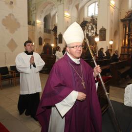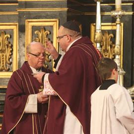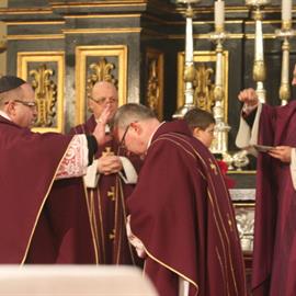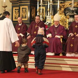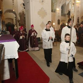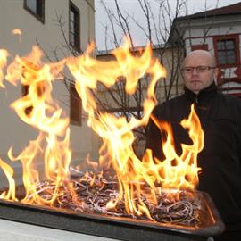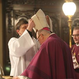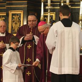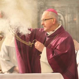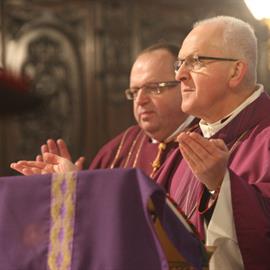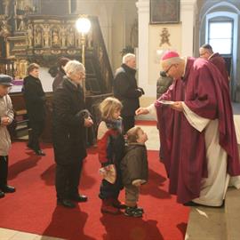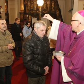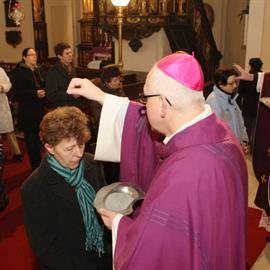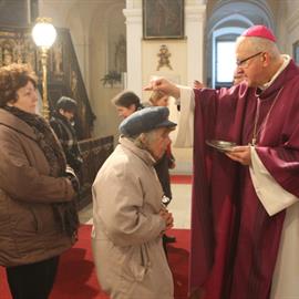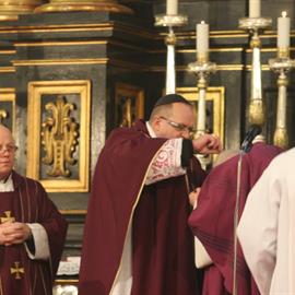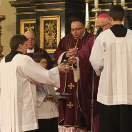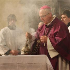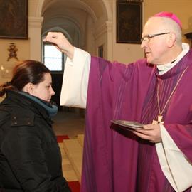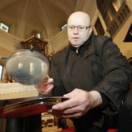 příprava popele na Popeleční středu (kostelník katedrály sv. Štěpána v Litoměřicích Antonín Fegyveres, 11. února 2013), Popeleční středa, mše svatá s udílením popelce, hlavní celebrant litoměřický biskup Mons. Jan Baxant, 13. února 2013, katedrála sv. Štěpána, Litoměřice