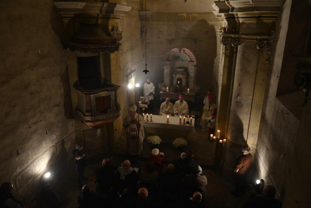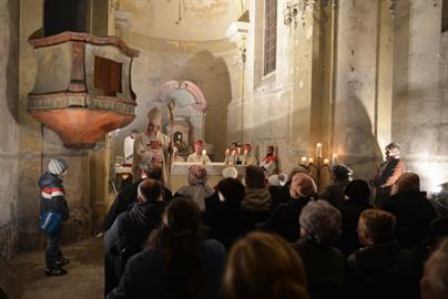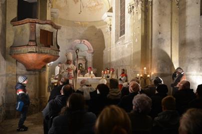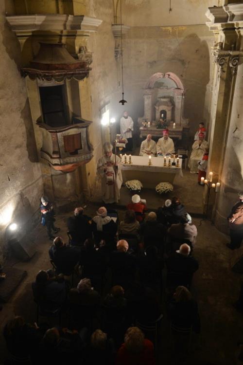 Mše svatá sloužená po přibližně půlstoletí v postupně opravovaném kostele v Mlékojedech, hlavní celebrant litoměřický biskup Mons. Jan Baxant, koncelebranti: generální vikář Mons. Martin Davídek, děkan katedrální kapituly can. Karel Havelka a děkan litoměřické městské farnosti can. Józef Szeliga, 11. 11. 2016, kostel sv. Martina, Mlékojedy u Litoměřic