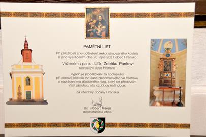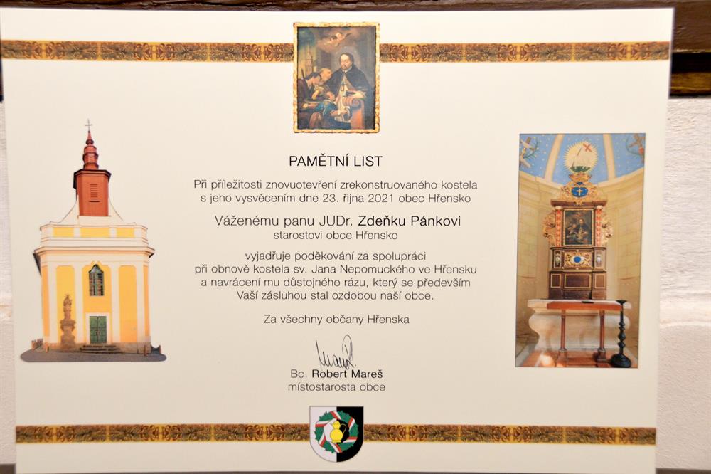 V sobotu 23. října 2021 požehnal po opravě generální vikář Mons. Martin Davídek kostel sv. Jana Nepomuckého v Hřensku. Kostel, který je v majetku obce, byl celkově rekonstruován jak v exteriéru, tak i v interiéru. V rámci opravy proběhlo i obnovení původní výmalby, byla kompletně opraveny varhany, osvětlení kostela a interiér byl doplněn o novou křížovou cestu. Slavnost v kostele byla zahájena v 10 hodin, kdy starosta Hřenska JUDr. Zdeněk Pánek přivítal ty, kteří se podíleli na rekonstrukci, řadu podnikatelů, kteří na zmíněnou rekonstrukci přispěli a významné hosty mezi nimiž nechyběl ani primátor města Děčín Ing. Jiří Anděl, CSc. Starosta Hřenska JUDr. Zdeněk Pánek promluvil o průběhu oprav a předal pamětní listy těm, kteří se o tyto opravy zasloužili. V 11 hodin při mši svaté proběhlo požehnání kostela a obnovených varhan. S generálním vikářem koncelebroval duchovní správce hřenské farnosti děčínský děkan R.D. Tomáš Kuba. V závěru bohoslužby požehnal generální vikář rovněž křížovou cestu a starosta, poté co promluvil o historii kostela, předal přítomným kněžím pamětní listy připomínací toto znovuobnovení dominanty obce. Ať sv. Jan Nepomucký jemuž je kostel zasvěcen a jehož socha stojí před kostelem se přimlouvá za obec Hřensko i celou farnost, která se nachází na hranicích s Německem, kde je tento český patron také velmi uctíván.