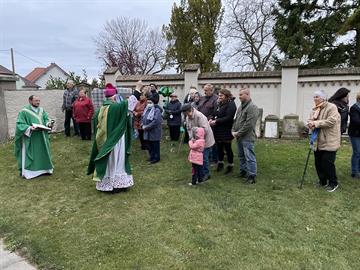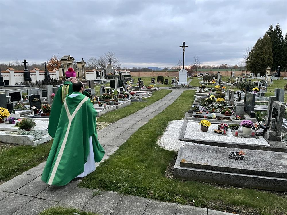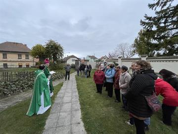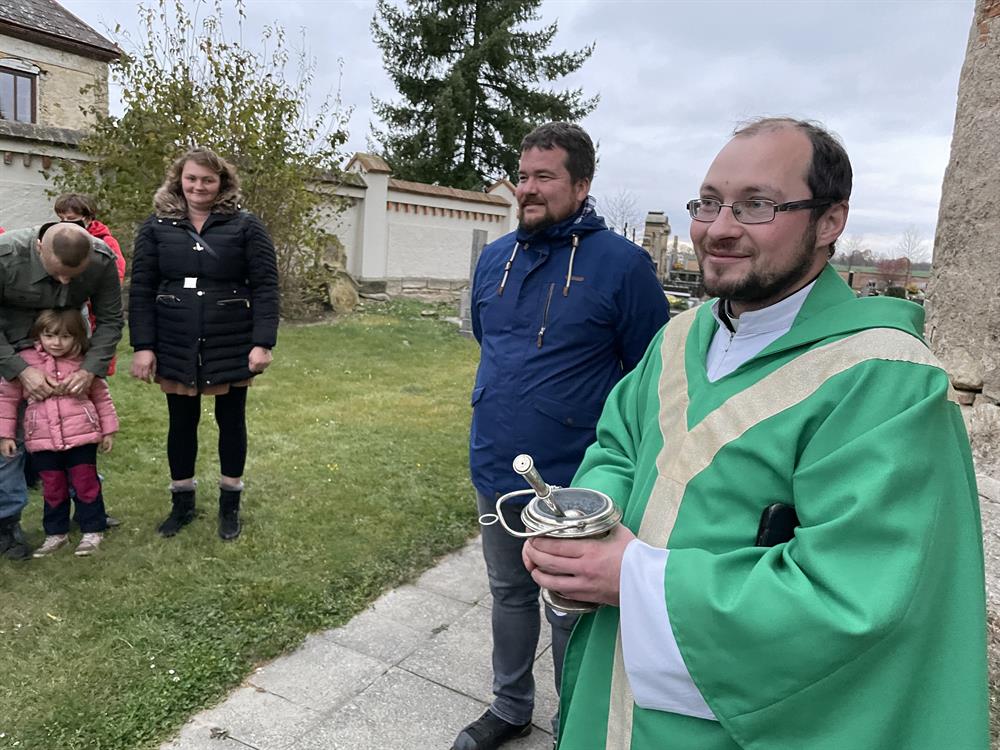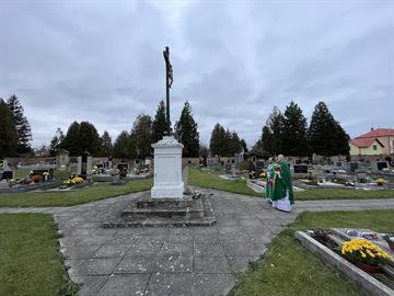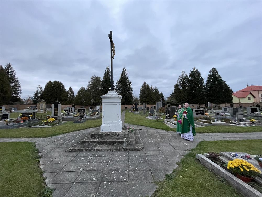 všechny věrné zemřelé a kněží se šli pomodlit k centrálnímu kříži na místním