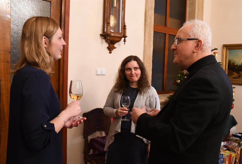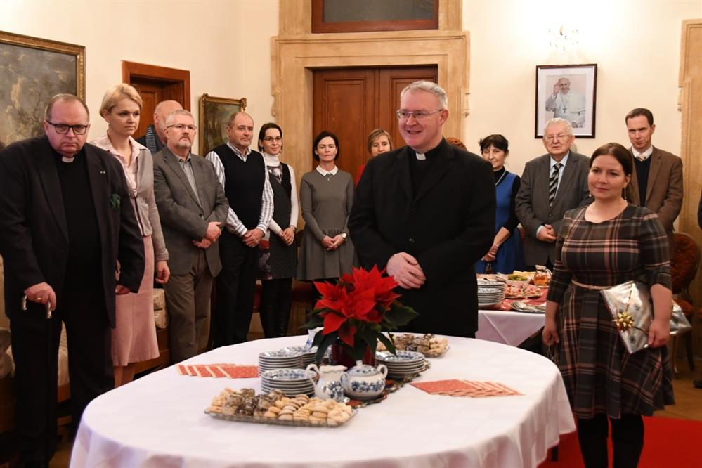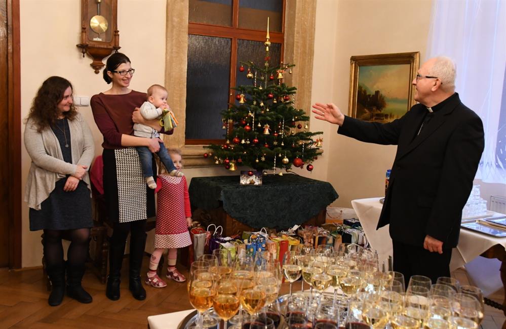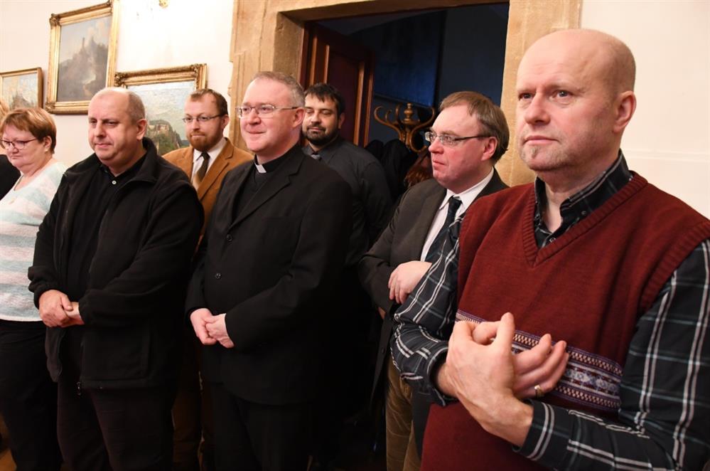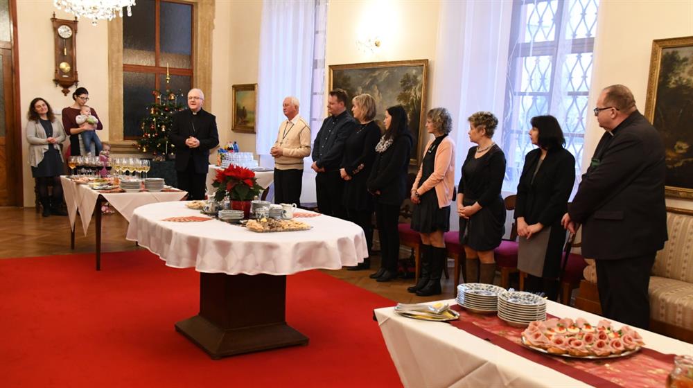 Předvánoční setkání zaměstnanců biskupství s biskupem Janem Baxantem a generálním vikářem Martinem Davídkem, setkání se účastnil také probošt katedrální kapituly, prelát Jiří Hladík O.Cr., 21. prosince 2017, biskupská rezidence, Litoměřice