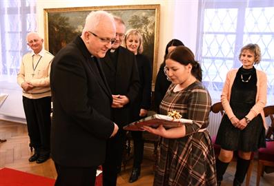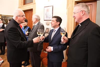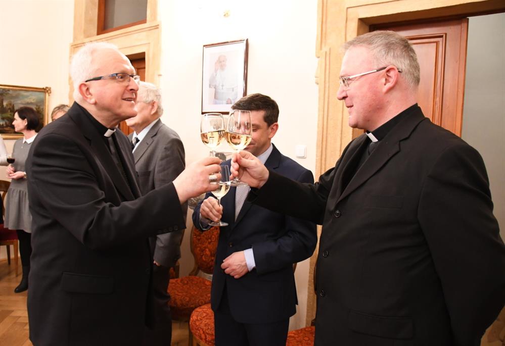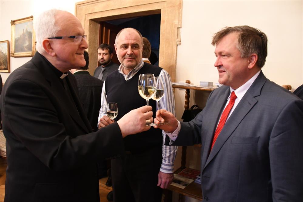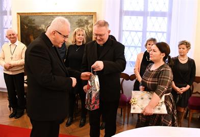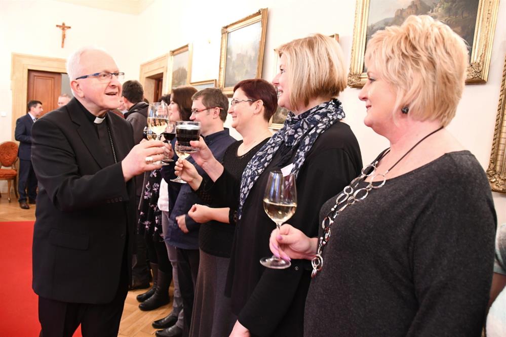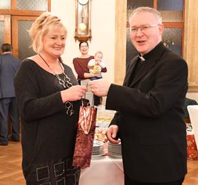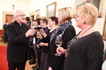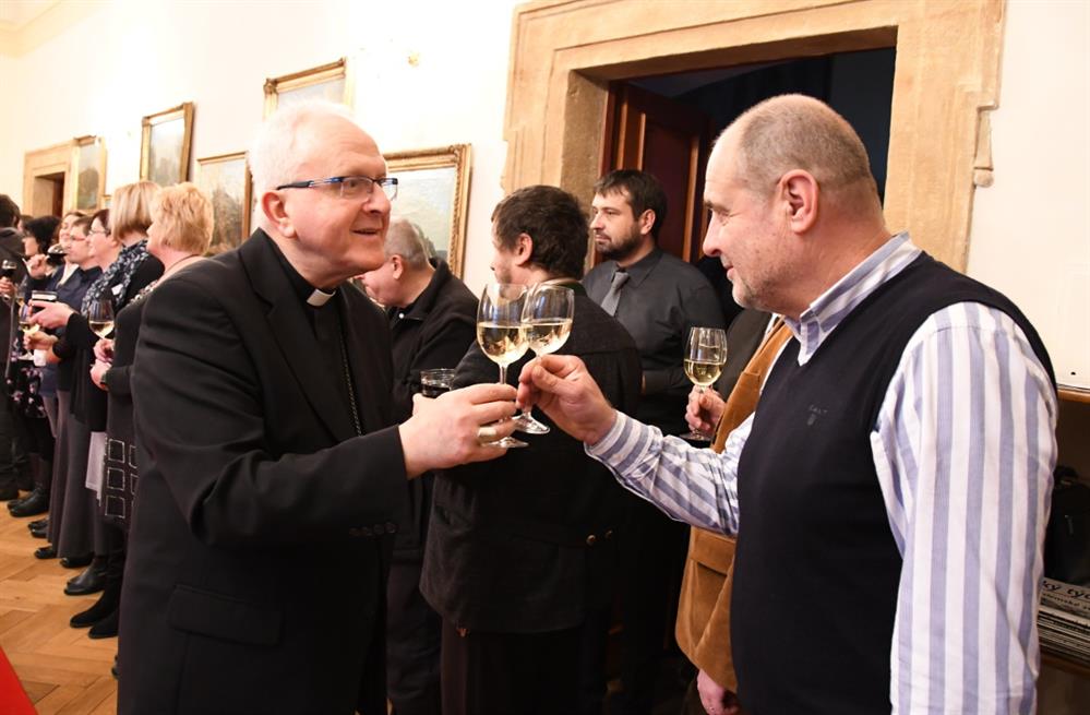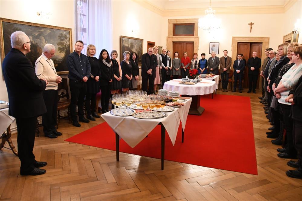 Předvánoční setkání zaměstnanců biskupství s biskupem Janem Baxantem a generálním vikářem Martinem Davídkem, setkání se účastnil také probošt katedrální kapituly, prelát Jiří Hladík O.Cr., 21. prosince 2017, biskupská rezidence, Litoměřice