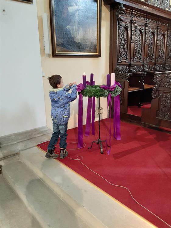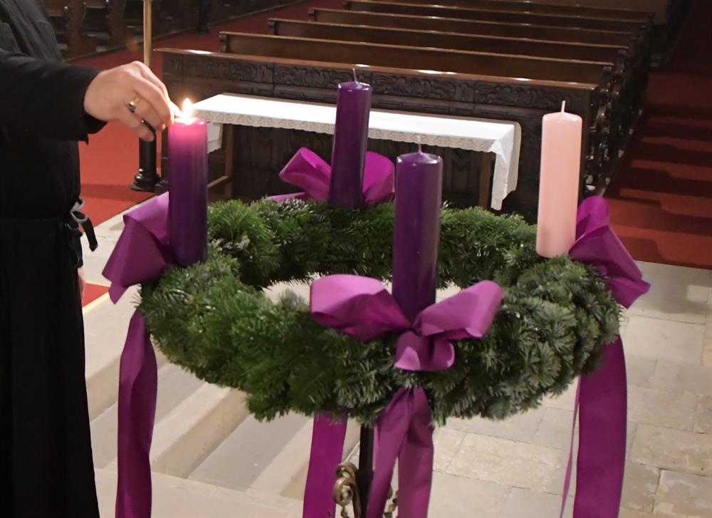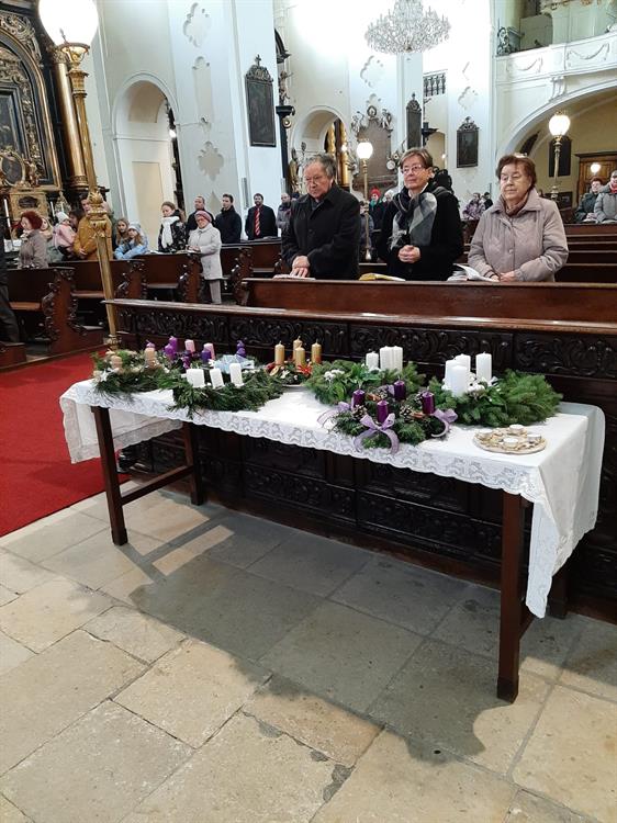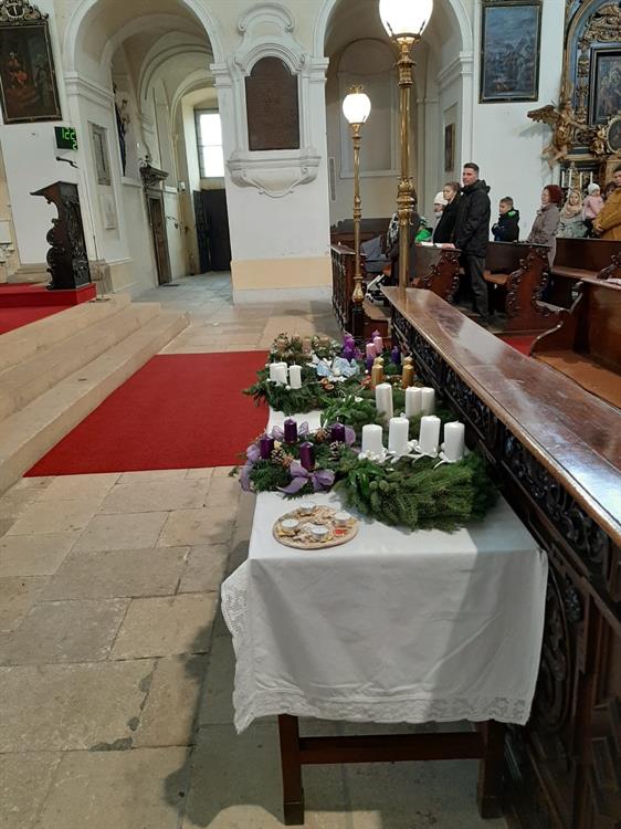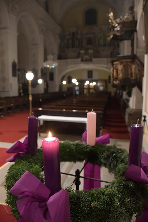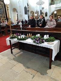 věnec a také věnce, které si věřící přinesli. Rozsvícená svíčka na adventním
