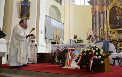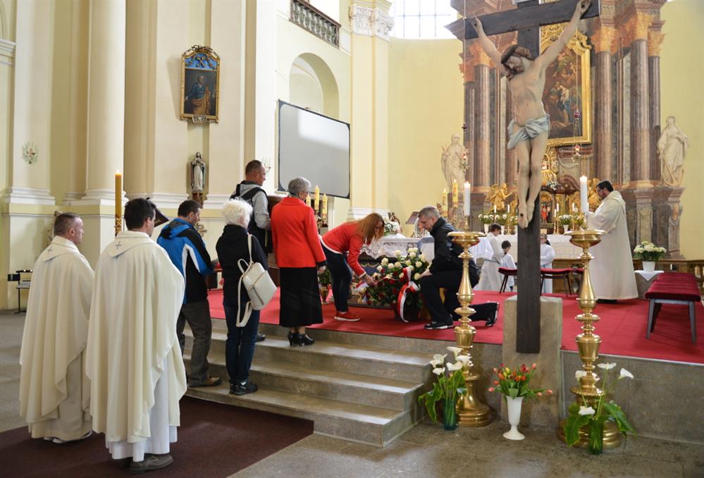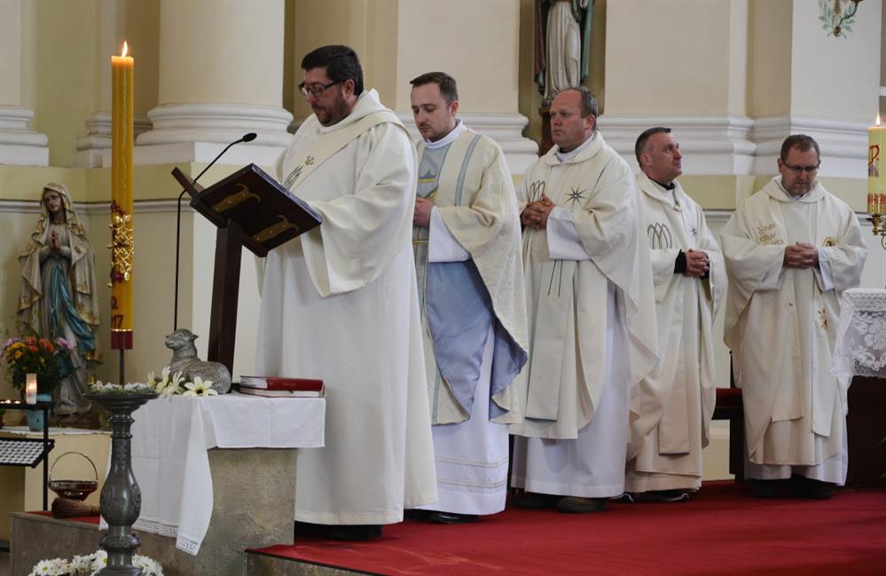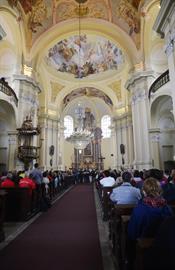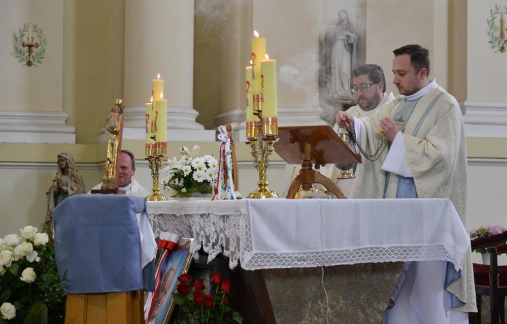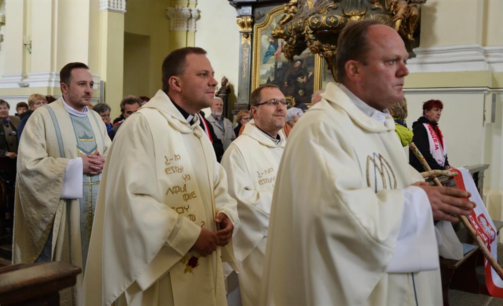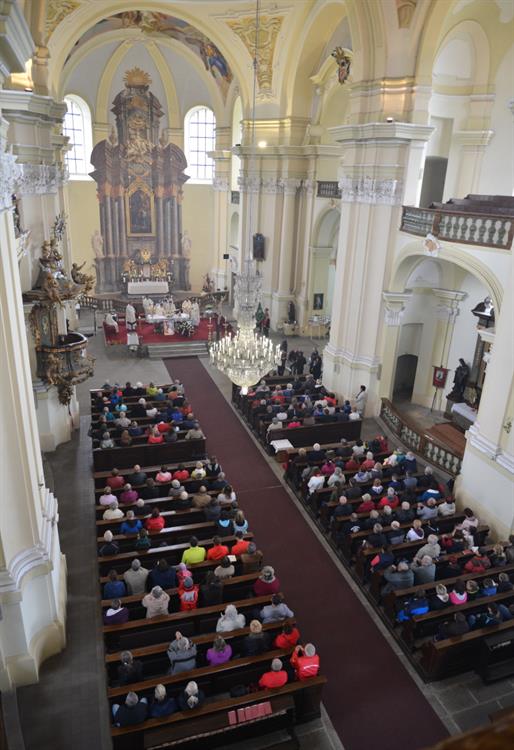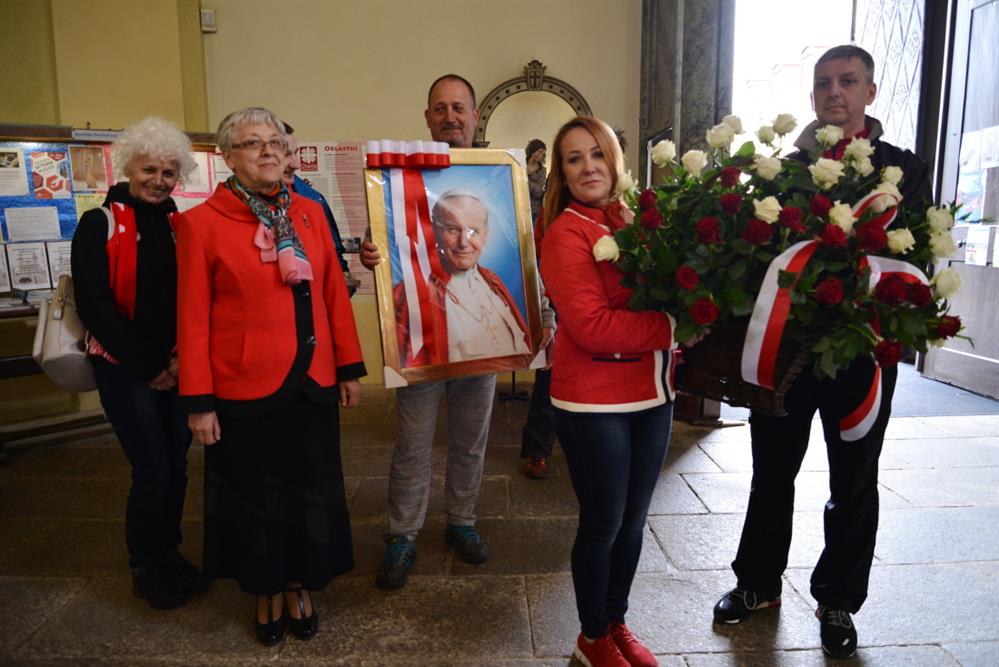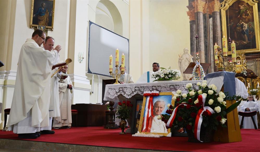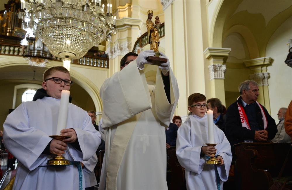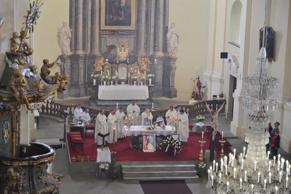 První Májová – mariánská slavnost s českými, polskými a německými poutníky a českými a polskými duchovními. Dar polských poutníků z farnosti Bogatynia - obraz sv. Jana Pavla II. Novokněžské požehnání uděloval R.D. Pavel Michalec. Mše svatá s originálem sošky milostné Panny Marie Hejnické, 1. 5. 2017, kostel Navštívení Panny Marie, Hejnice