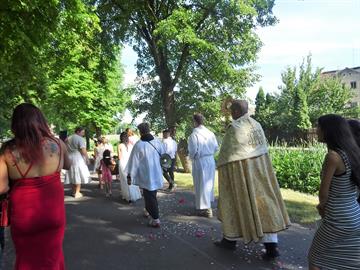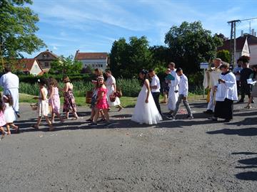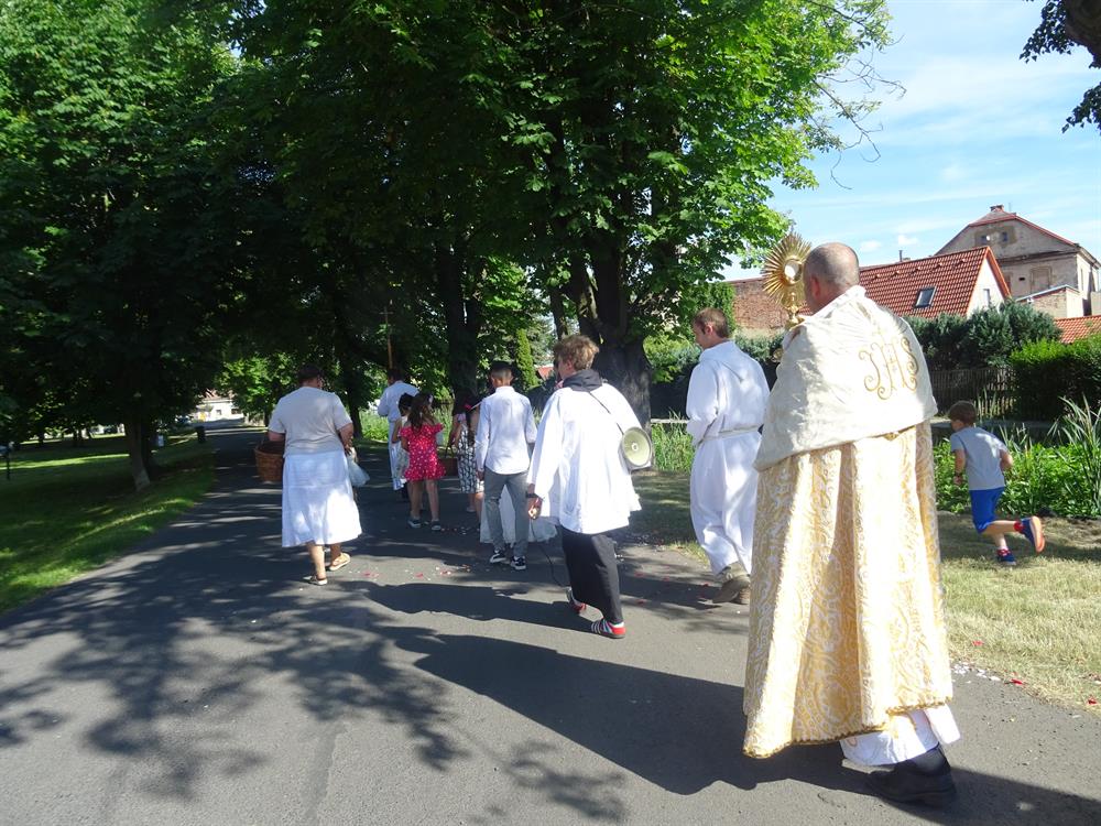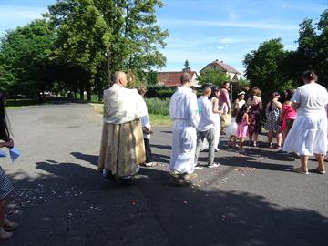 Tělem k oltářům v obci. V průvodu šli nejprve ministranti, po té družičky,