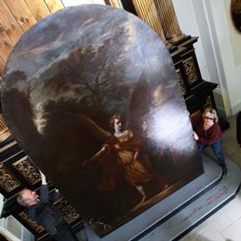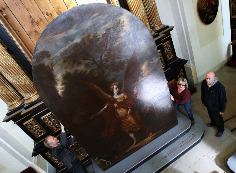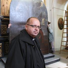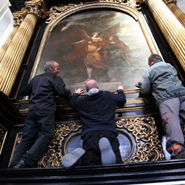osazení restaurovaného obrazu Archanděl Rafael se sv. Tobiášem od barokního malíře Karla Škréty (akad. mal. Eva Kolmanová), 15. říjen 2011, boční oltář Andělů strážných, katedrála sv. Štěpána, Litoměřice