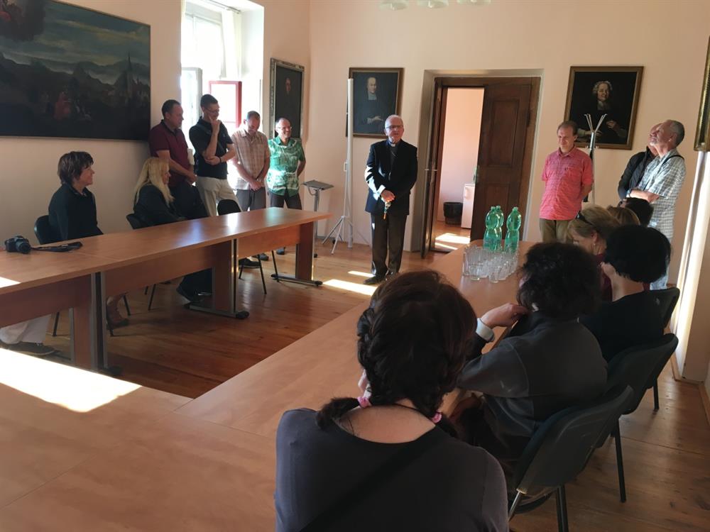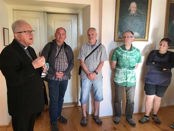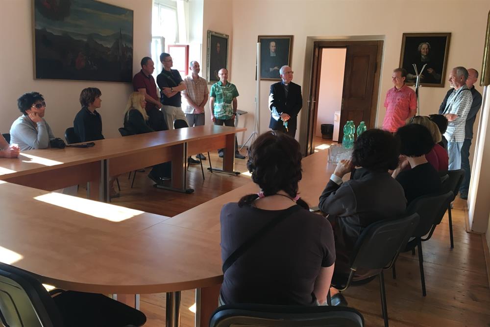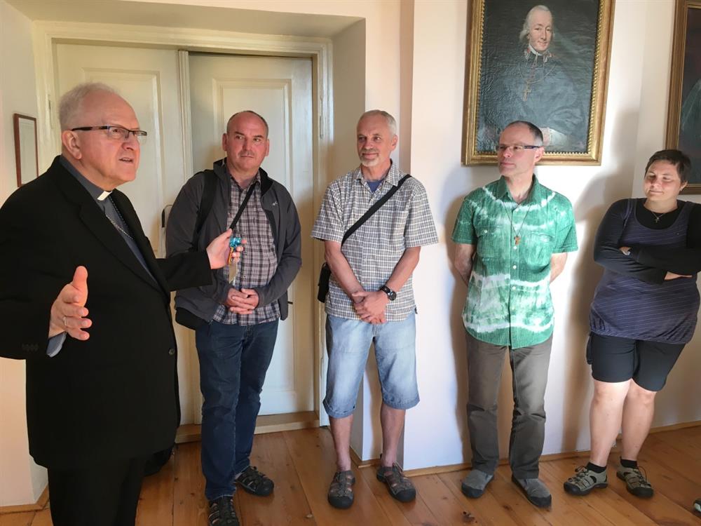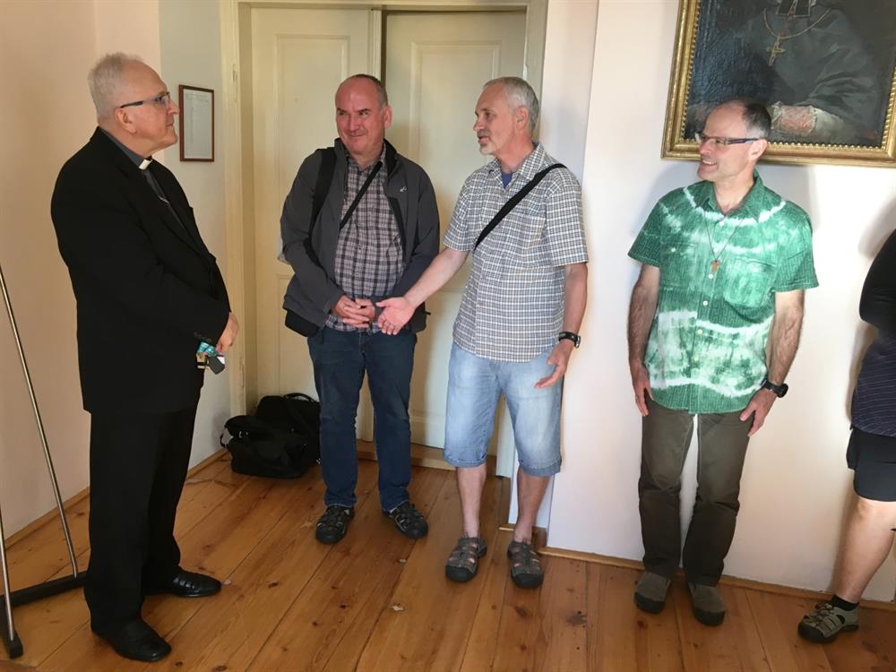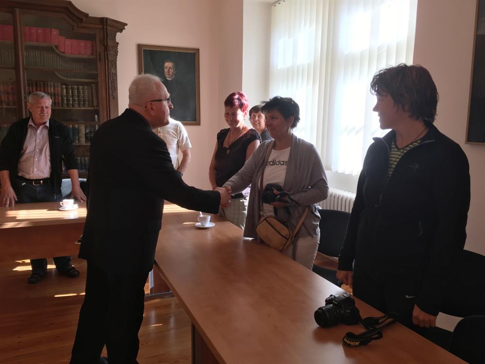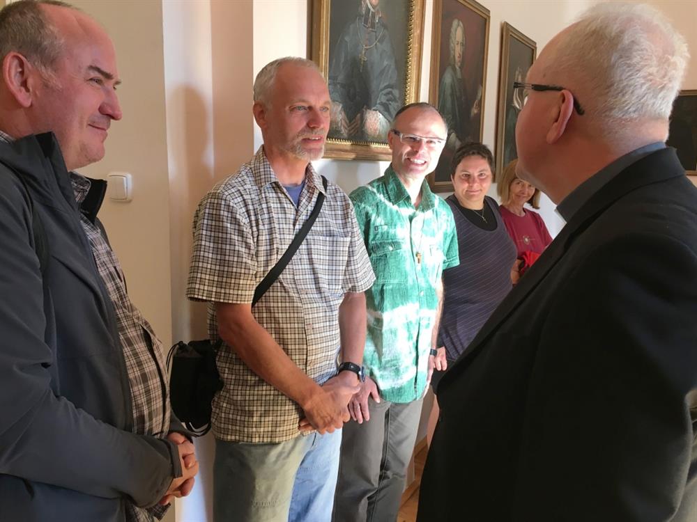 Setkání Mons. Jana Baxanta, biskupa litoměřického, s poutníky z Římskokatolické farnosti Nanebevzetí Panny Marie ve Žďáru nad Sázavou II. doprovázených farářem P. Vladimírem Vojtěchem Záleským a jáhnem Tomášem Maradou, 23. srpna 2017, biskupská kurie, Litoměřice