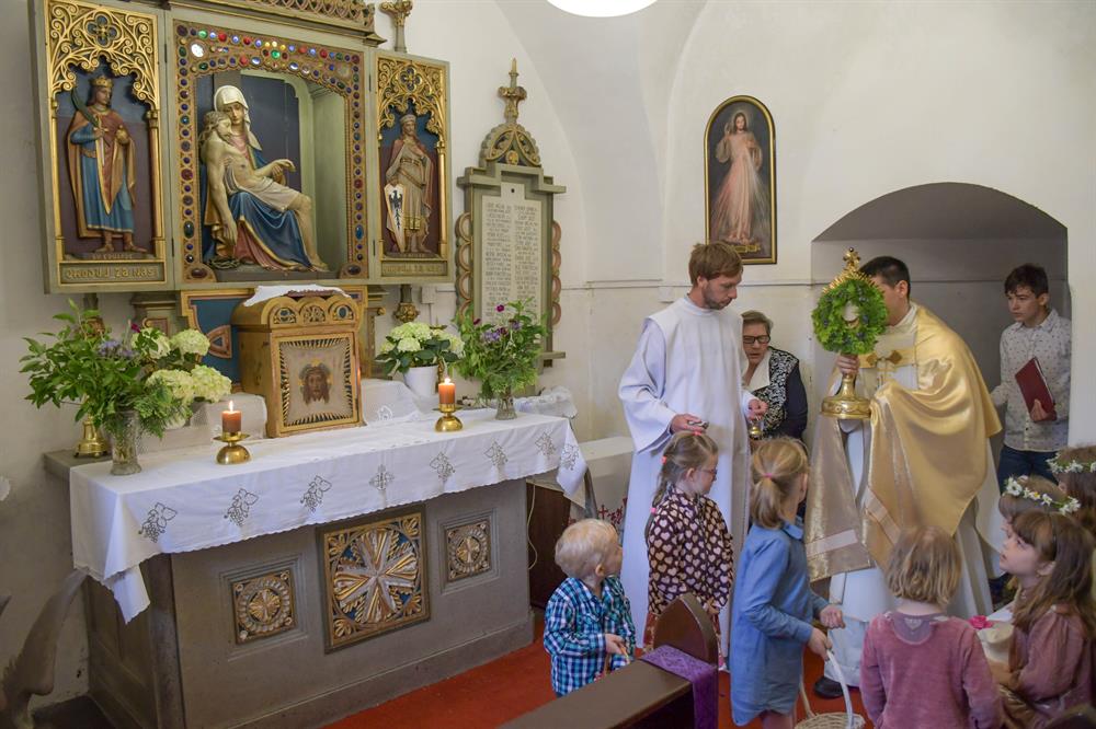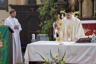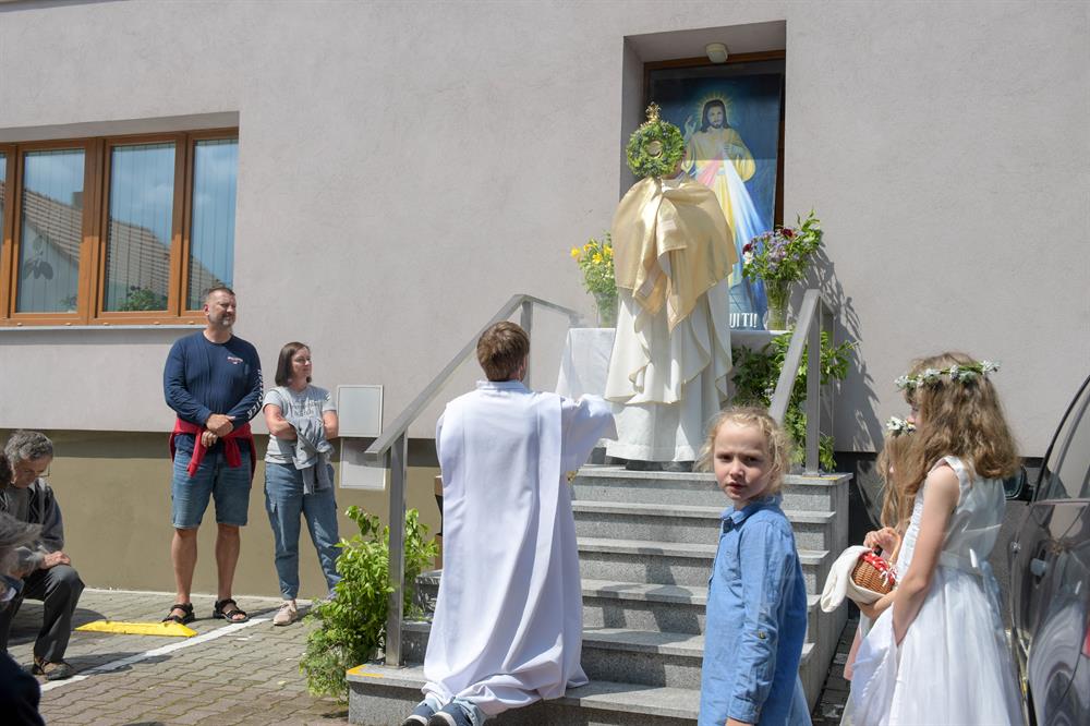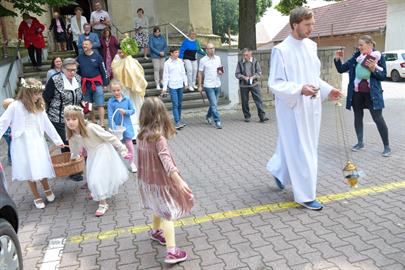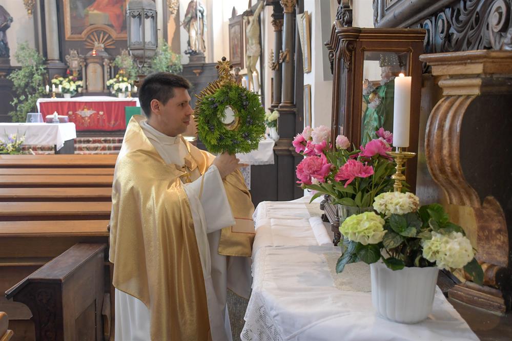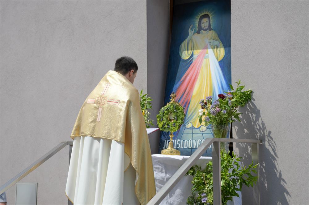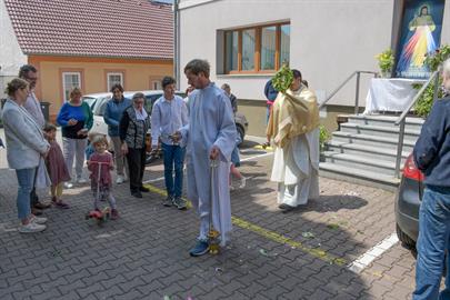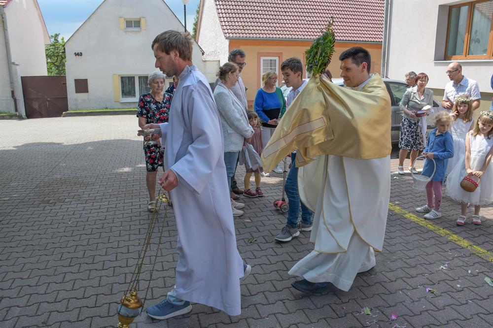 Slavnosti Těla a Krve Páně v kostele Narození Panny Marie v Třebenicích v neděli 2. června 2024 předsedal farář R.D. Lukáš Hrabánek. Věřící se po mši svaté v eucharistickém průvodu pomodlili u čtyř oltářů.