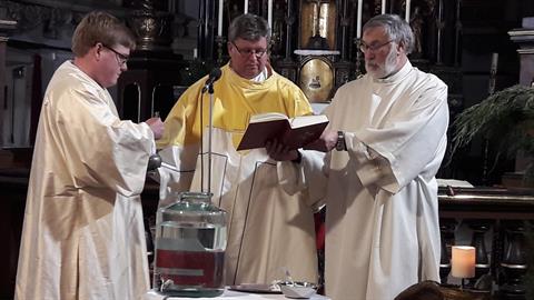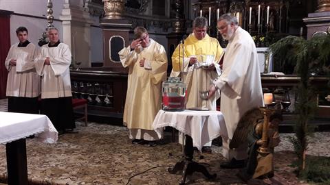 Panny Marie Bolestné v Bohosudově žehnání vody, kadidla a křídy při mši svaté.