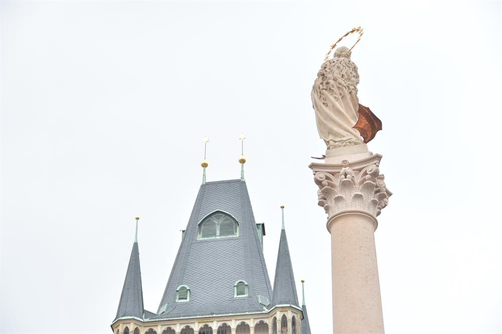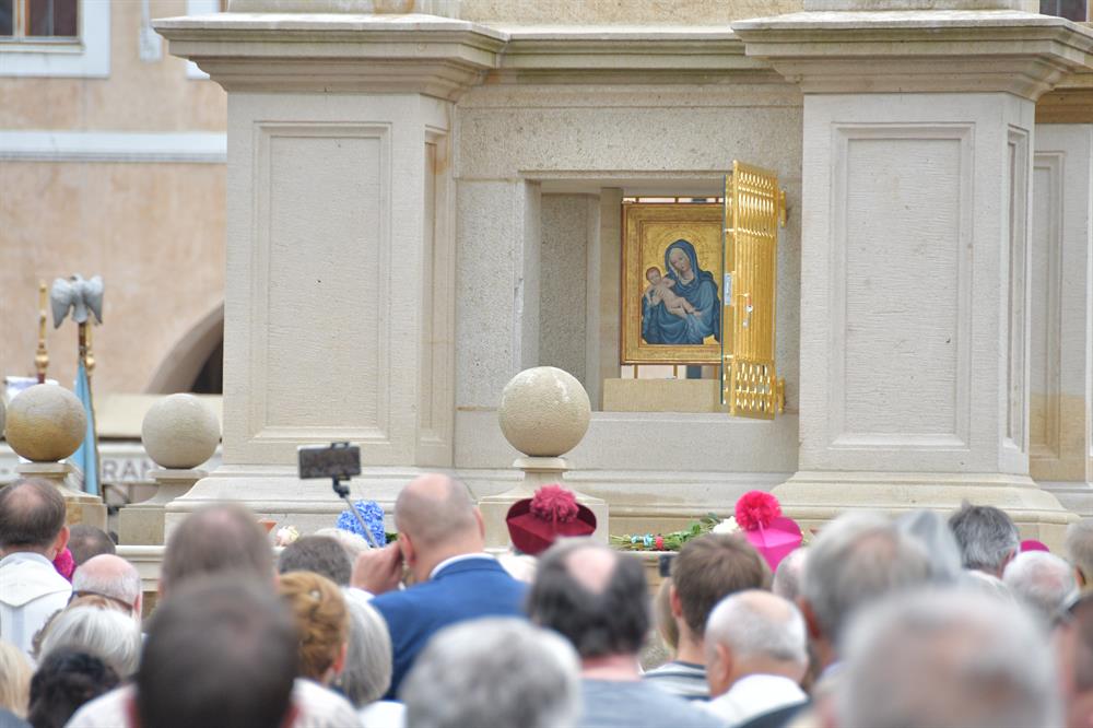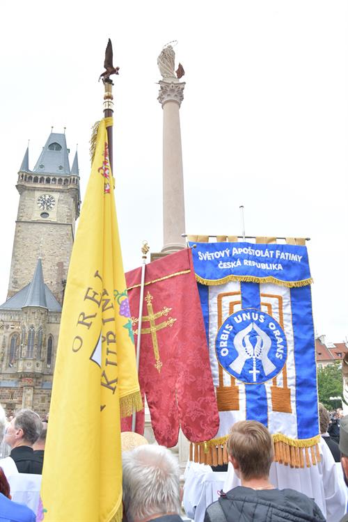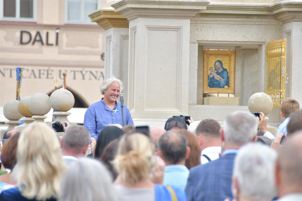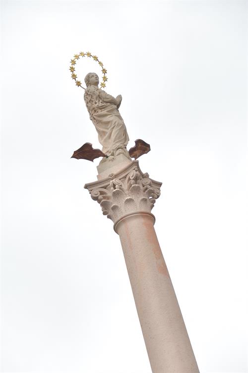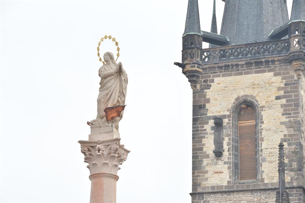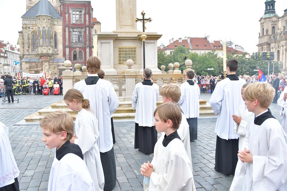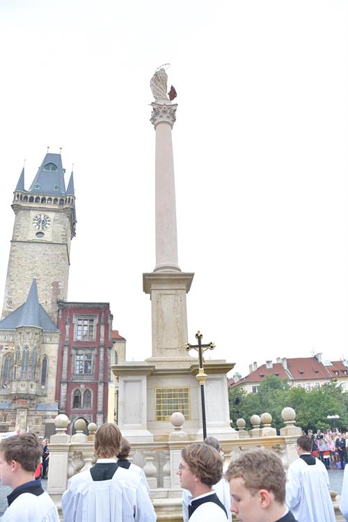 V sobotu 15. srpna 2020, na svátek Nanebevzetí Panny Marie, se na Staroměstském náměstí v Praze konala slavnost posvěcení znovuobnoveného Mariánského sloupu za přítomnosti velkého množství věřících. Hned na úvod od 10 hodin začala bohoslužba v Chrámu Matky Boží před Týnem, kterou celebroval arcibiskup pražský a primas český Dominik kardinál Duka. Poté vyšel průvod zúčastněných biskupů, kněží, rytířských řádů, Orlů, krojovaných skupin a dalších hostů na náměstí k Mariánskému sloupu, který kardinál požehnal. Ve svém proslovu připomněl, že sloup se sochou Panny Marie není symbolem katolické zpupnosti, ale je výrazem vděčnosti za pomoc ve válkách, nemocech a těžkých časech. Ke slovu se dostali také další řečníci, např. starosta Městské části Praha 1 Ing. Petr Hejma, nebo autor repliky sloupu akademický sochař Petr Váňa. Mariánský sloup se tak vrátil na Staroměstské náměstí po 102 letech.