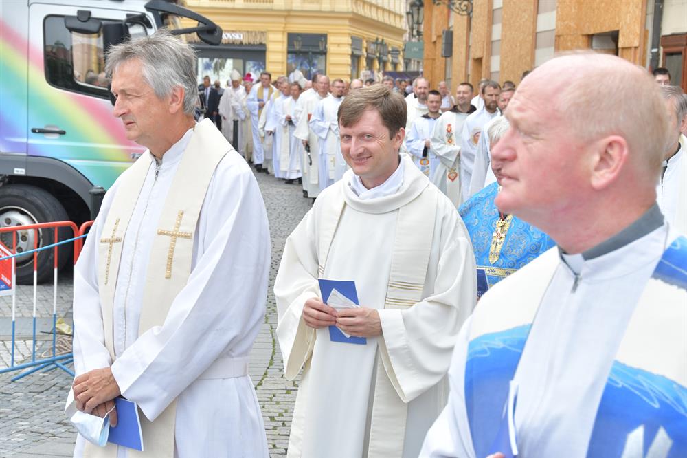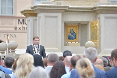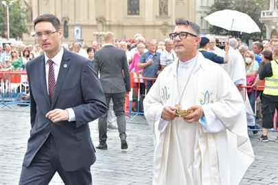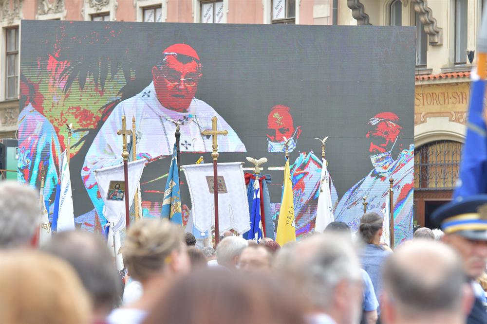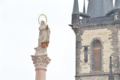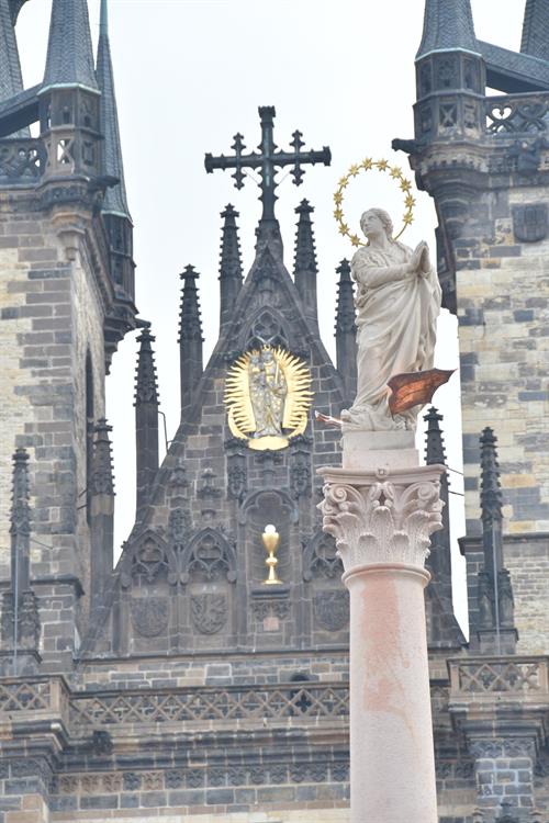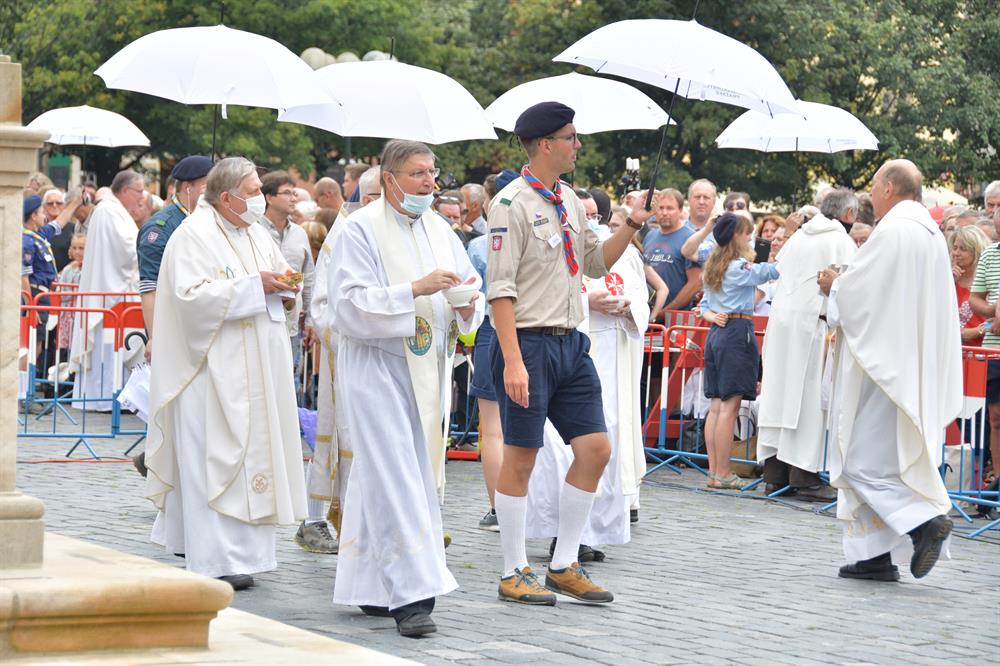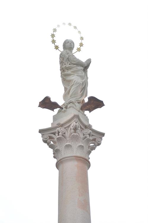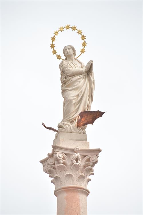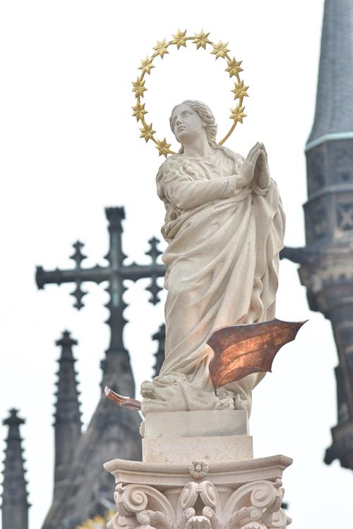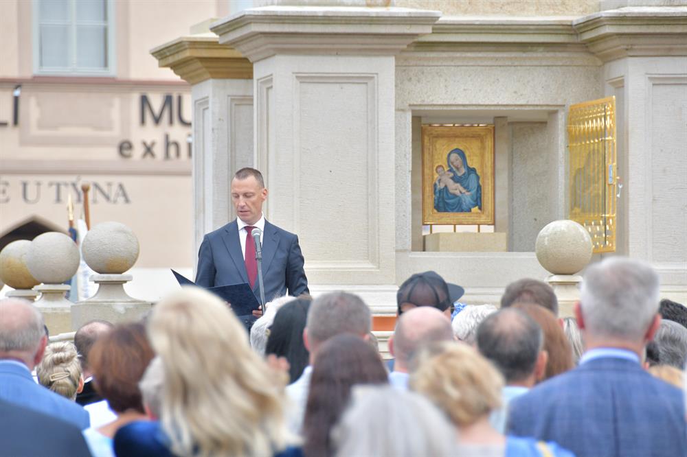 V sobotu 15. srpna 2020, na svátek Nanebevzetí Panny Marie, se na Staroměstském náměstí v Praze konala slavnost posvěcení znovuobnoveného Mariánského sloupu za přítomnosti velkého množství věřících. Hned na úvod od 10 hodin začala bohoslužba v Chrámu Matky Boží před Týnem, kterou celebroval arcibiskup pražský a primas český Dominik kardinál Duka. Poté vyšel průvod zúčastněných biskupů, kněží, rytířských řádů, Orlů, krojovaných skupin a dalších hostů na náměstí k Mariánskému sloupu, který kardinál požehnal. Ve svém proslovu připomněl, že sloup se sochou Panny Marie není symbolem katolické zpupnosti, ale je výrazem vděčnosti za pomoc ve válkách, nemocech a těžkých časech. Ke slovu se dostali také další řečníci, např. starosta Městské části Praha 1 Ing. Petr Hejma, nebo autor repliky sloupu akademický sochař Petr Váňa. Mariánský sloup se tak vrátil na Staroměstské náměstí po 102 letech.