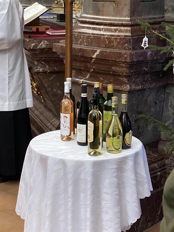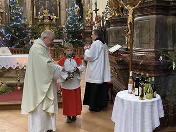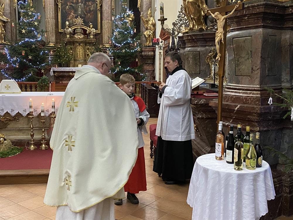 pochází. Požehnané víno si místní farníci po mši svaté odnesli do svých domovů,