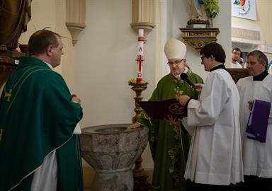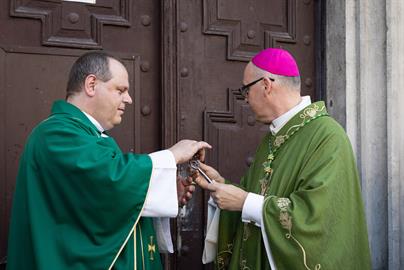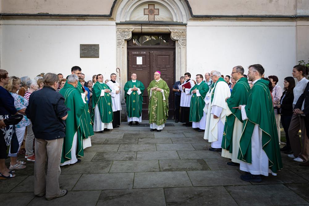 Věřící se shromáždili před kostelem sv. Františka z Assissi. Biskup přišel s klíči od kostela, které předal novému faráři P. Davidu Horáčkovi, aby chrám symbolicky odemkl. Spolu s věřícími, s biskupem, spolubratry P. Pavlem Hudouskem a P. Janem Kuníkem, dosavadním duchovním správcem P. Františkem Jiráskem a s kněžími z okolních farností i s provinciálem redemptoristů P. Jozefem Mihokem pak všichni vstoupili do chrámu.