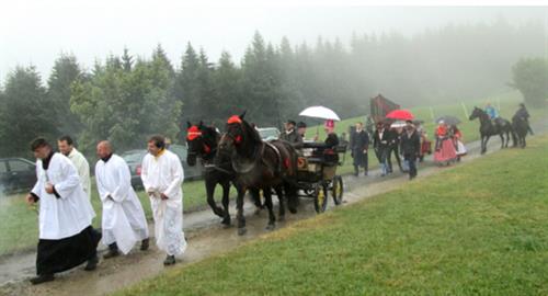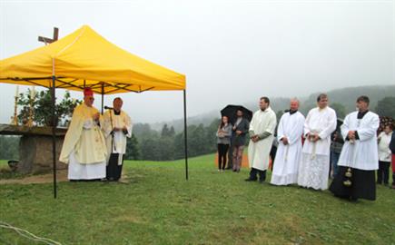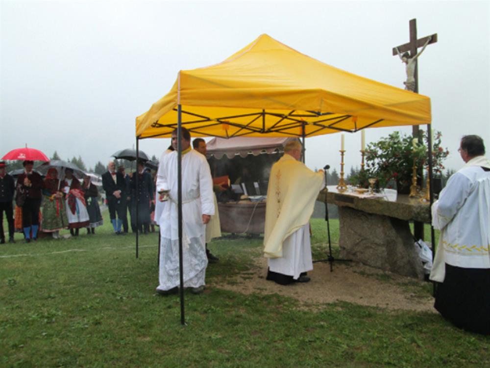 správcem Miroslavem Maňáskem poutní mši svatou. Obtíže způsoboval vydatný déšť,