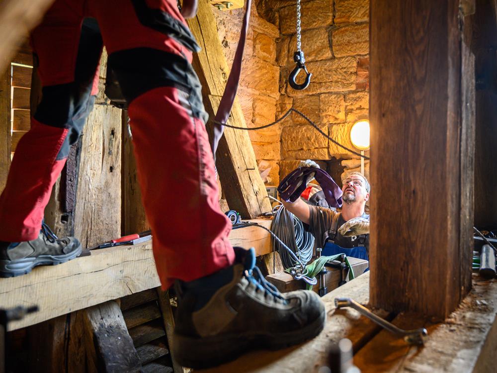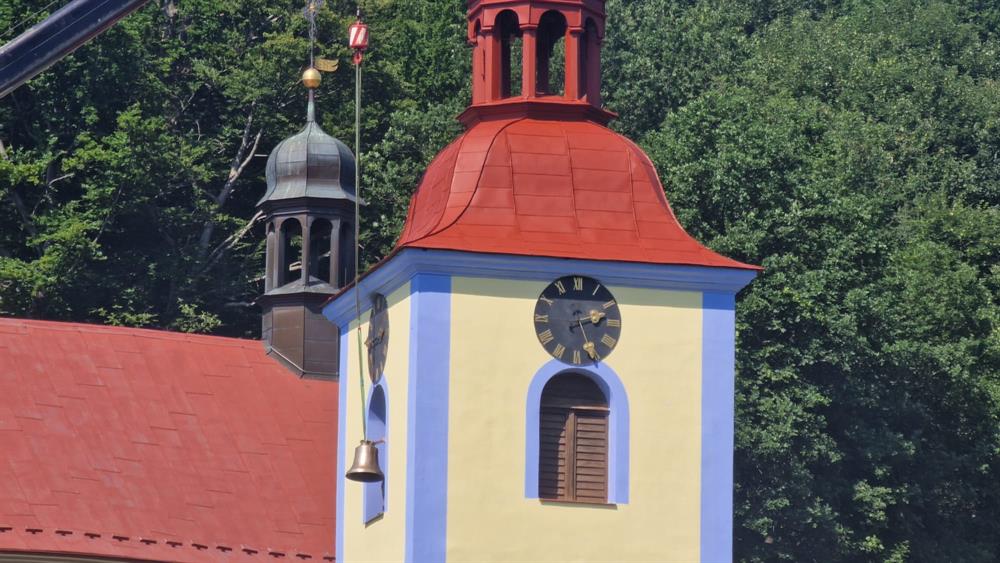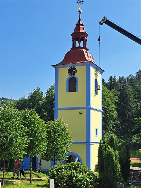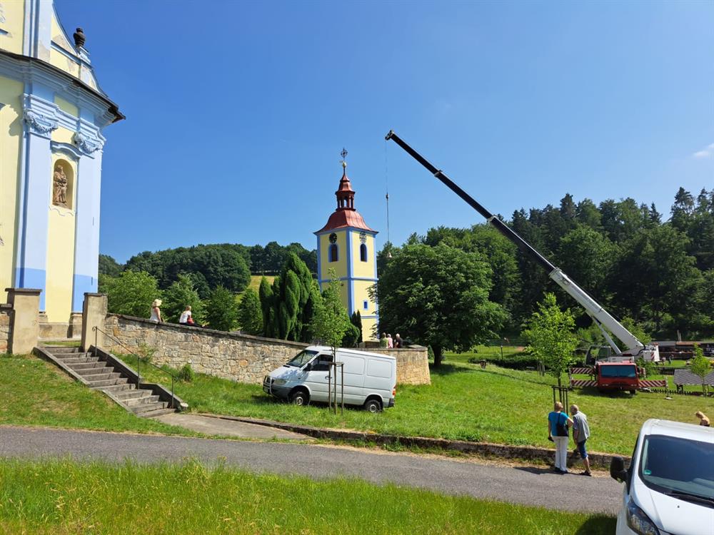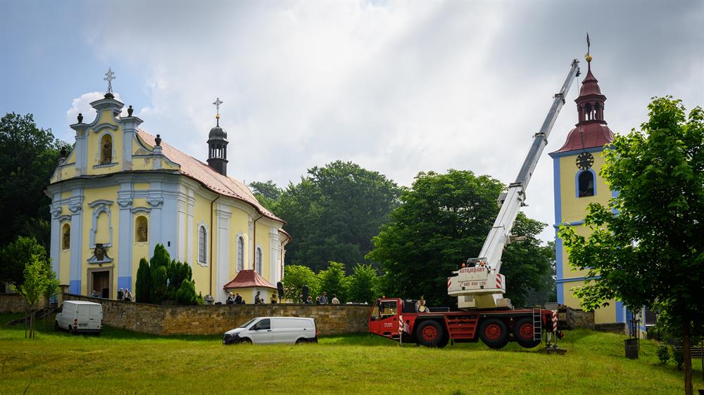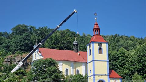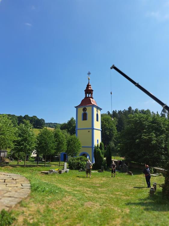 vytaženy přistaveným jeřábem do zvonice a pilní montéři z firmy Rudolf Perner z