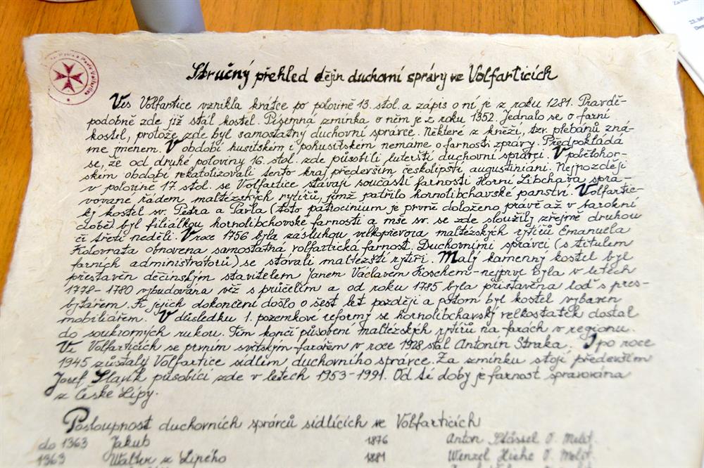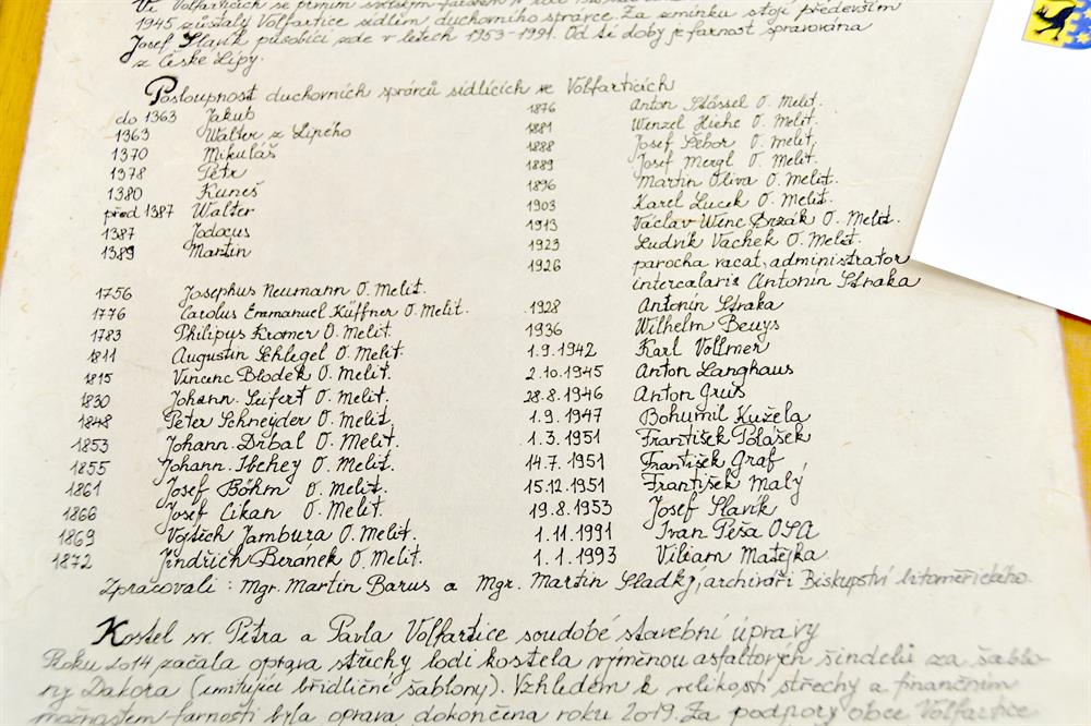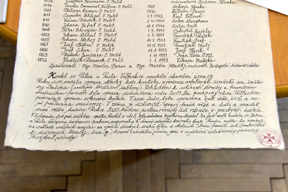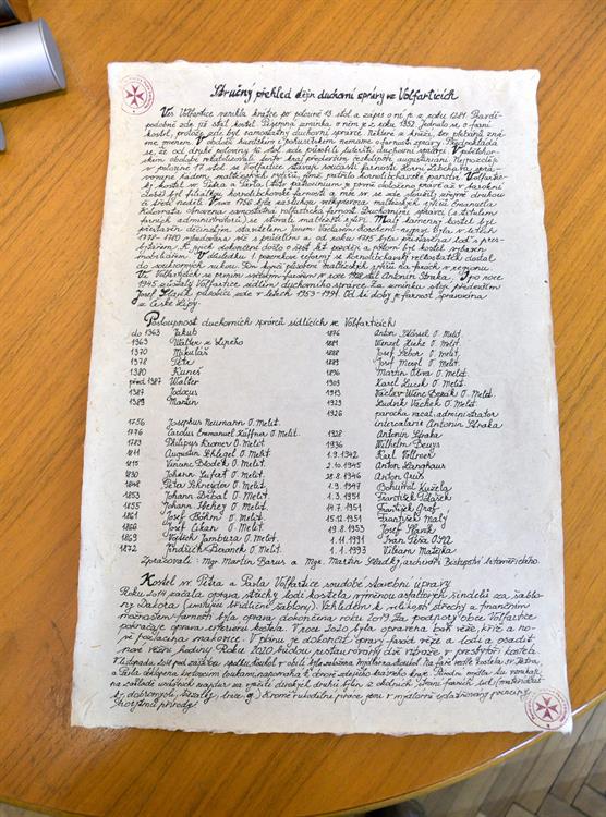 Ve čtvrtek 10. prosince 2020 se od 12.00 hodin konalo ve Volfarticích slavnostní požehnání opraveného kříže, který byl poté umístěn na špici věže kostela sv. Petra a Pavla. Do nové krásně pozlacené makovice byly při té příležitosti vloženy dvě časové schránky vyrobené z měděného plechu. V jedné z nich se nacházejí původní materiály z doby poslední opravy věže kostela před téměř 140 lety a vyjmuté při snášení kříže před opravou v říjnu t.r. Jedná se o dobové mince a dokumenty z let 1780, 1838 a 1881 vypovídající o stavu obce ve své době. Druhá časová schránka nově obsahuje novodobou historii Volfartic, včetně vzkazu paní starostky budoucím generacím. Vloženy byly také současné mince a dokonce dva exempláře dýchacích roušek, aby svědčily o časech, kdy celý svět ovlivnila pandemie coronaviru.