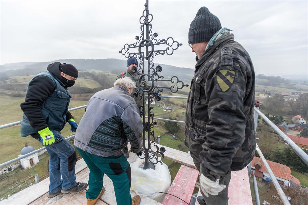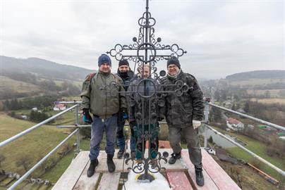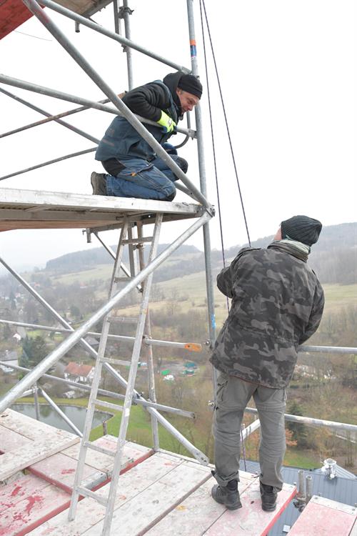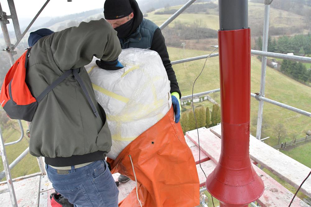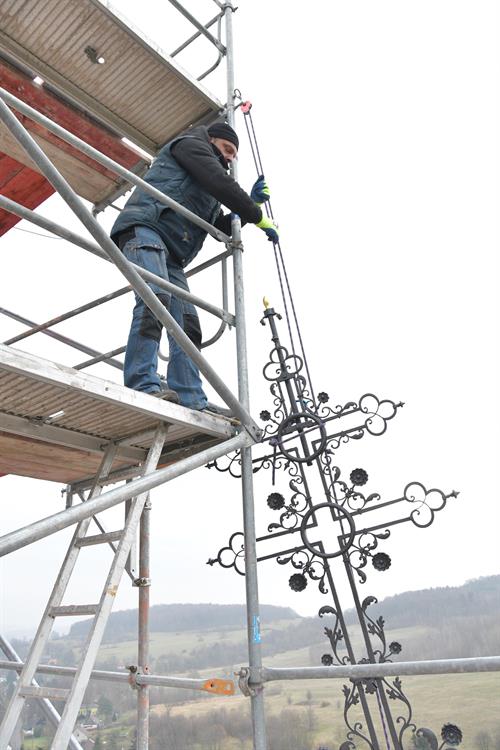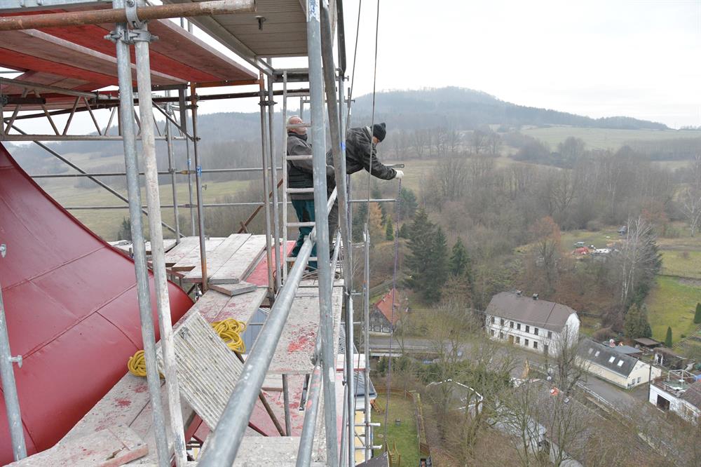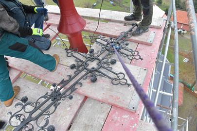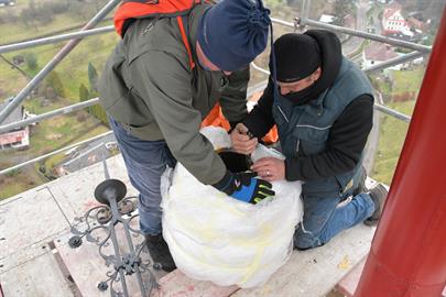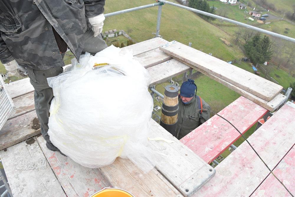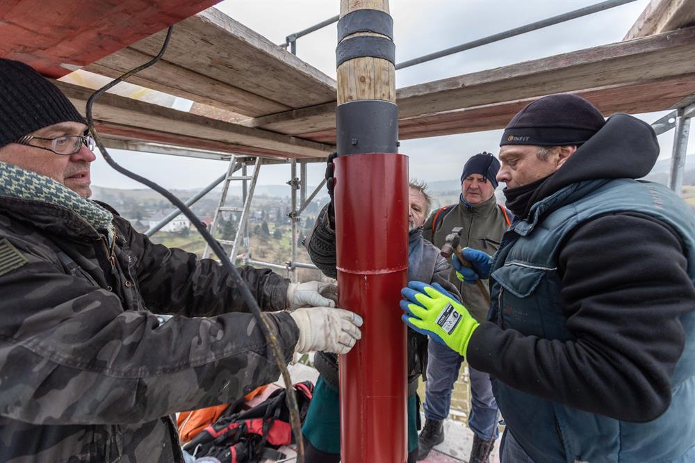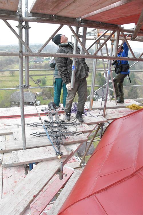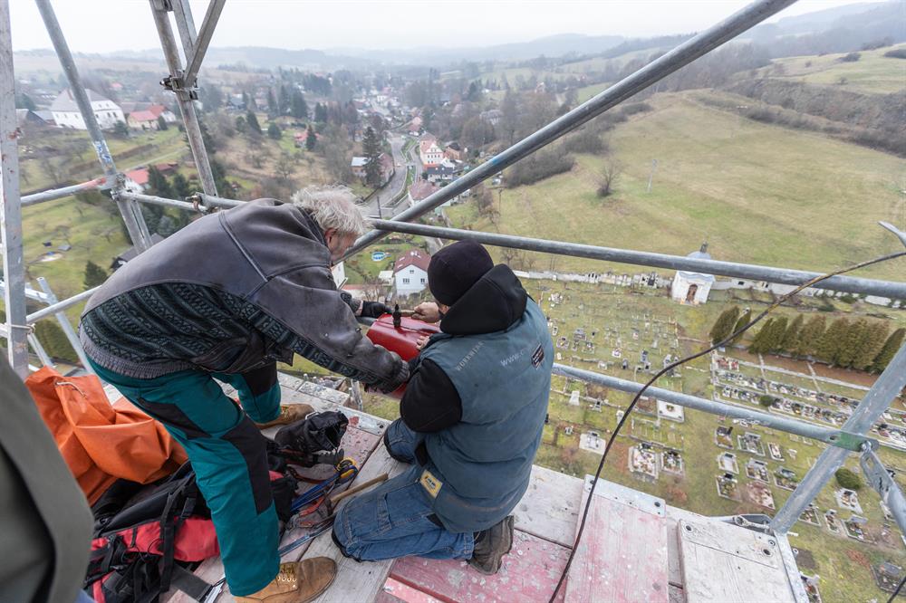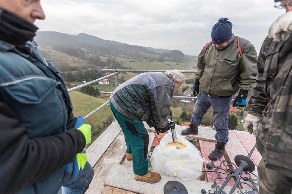 Uložení časových schránek do špice věže kostela ve Volfarticích