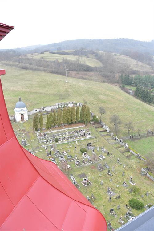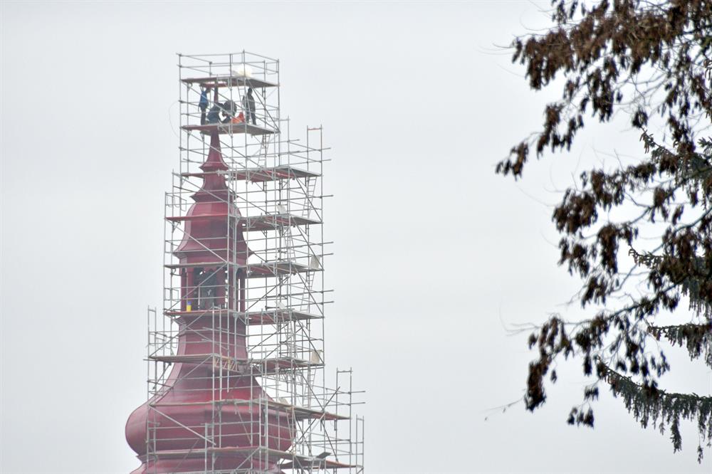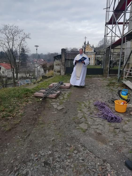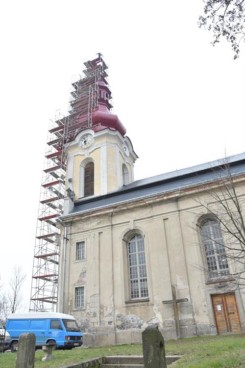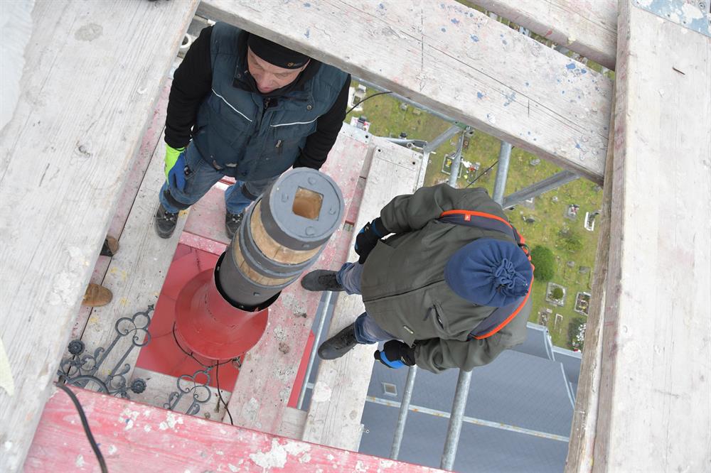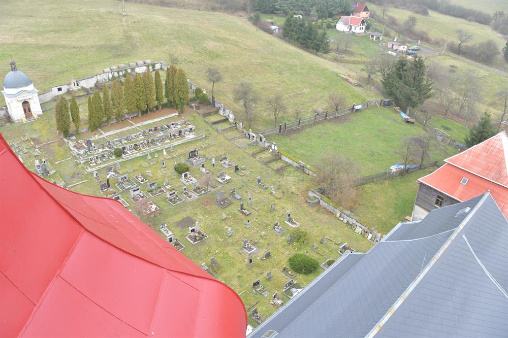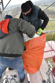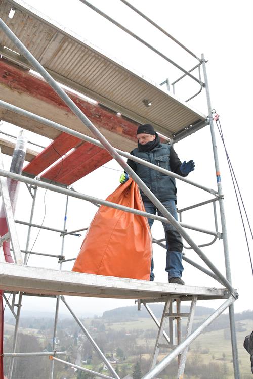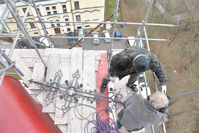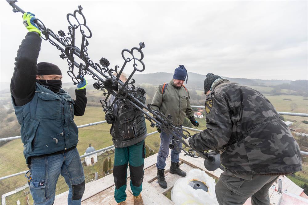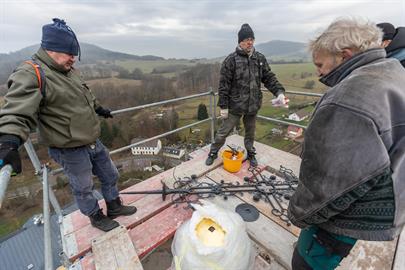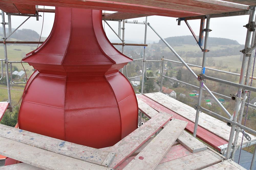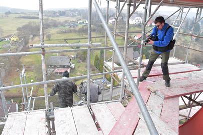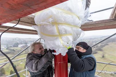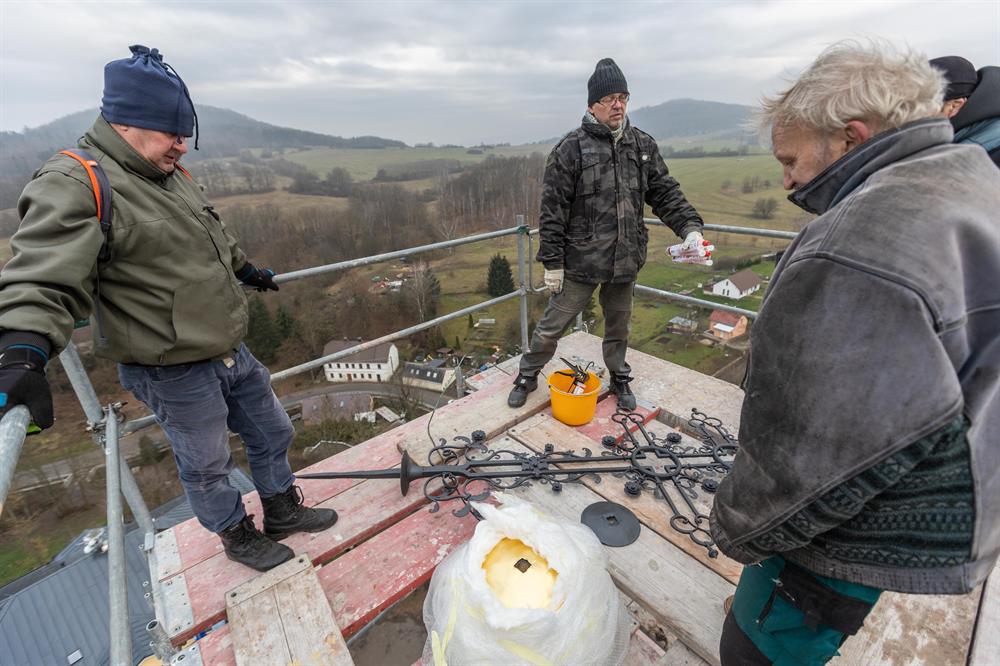 Uložení časových schránek do špice věže kostela ve Volfarticích