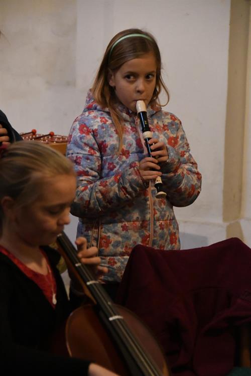 žáci s hudebním doprovodem paní učitelky Kateřiny