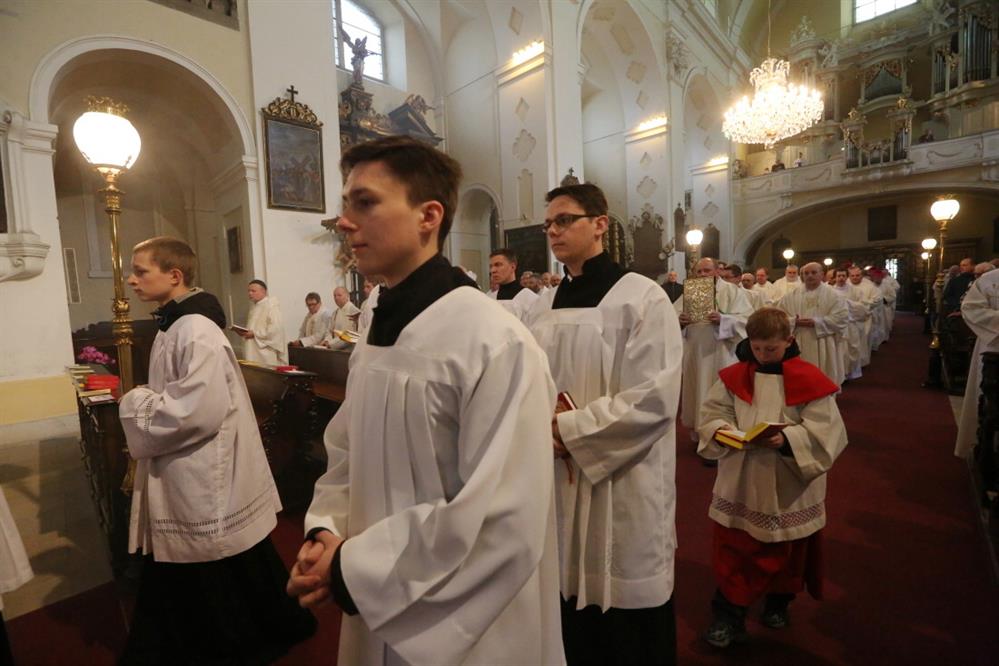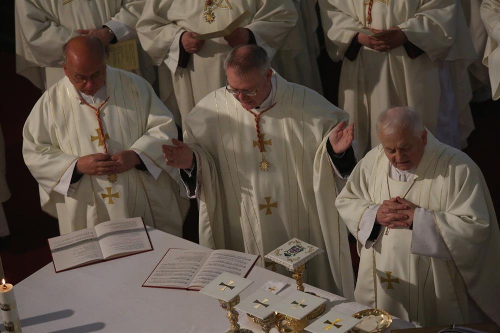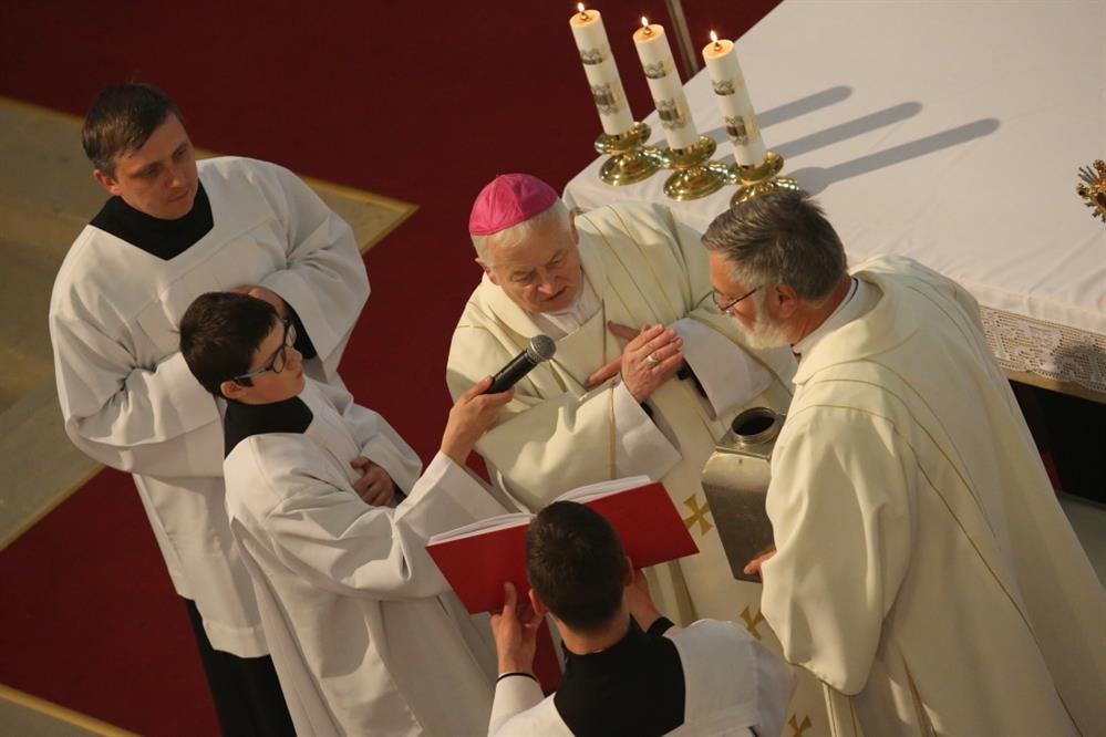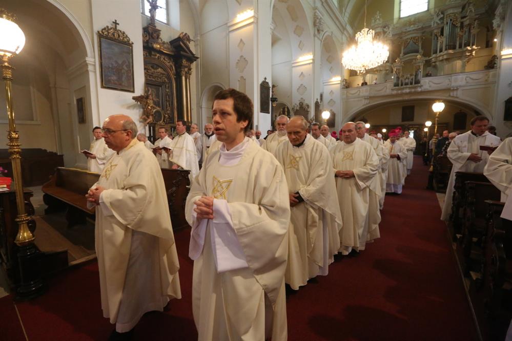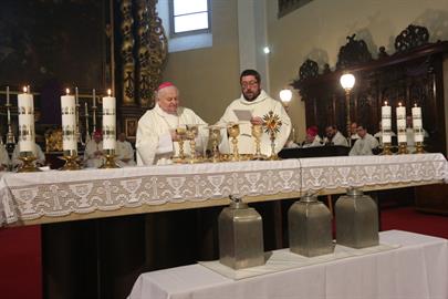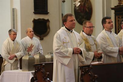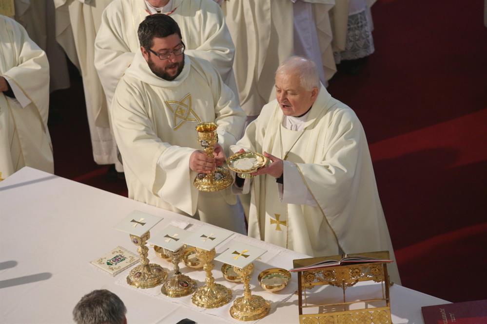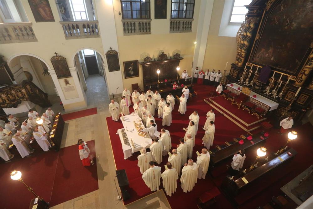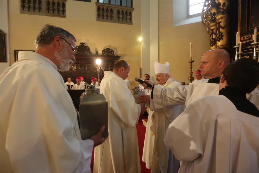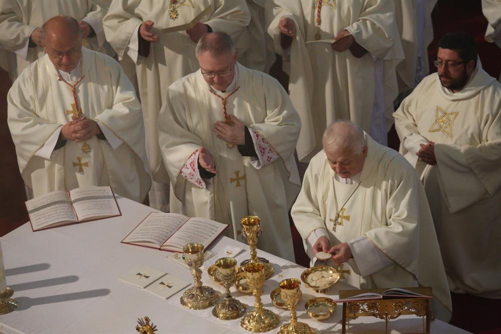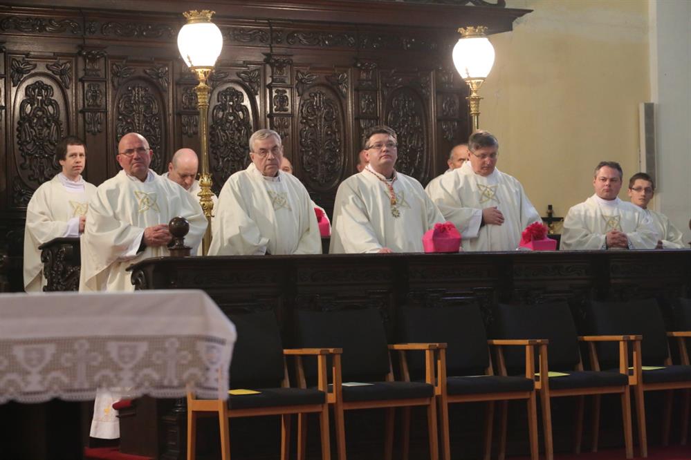 Missa chrismatis s emeritním světícím biskupem pražským Mons. Karlem Herbstem SDB, generálním vikářem litoměřické diecéze Mons. Martinem Davídkem, proboštem litoměřické katedrální kapituly P. Jiřím Hladíkem O.Cr. a kněžími litoměřické diecéze (slavnostní mše svatá s obnovením kněžských závazků a žehnáním posvátných olejů), Zelený čtvrtek, 13. duben 2017, katedrála sv. Štěpána, Litoměřice