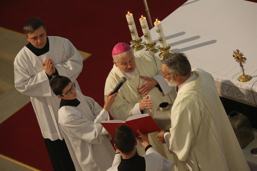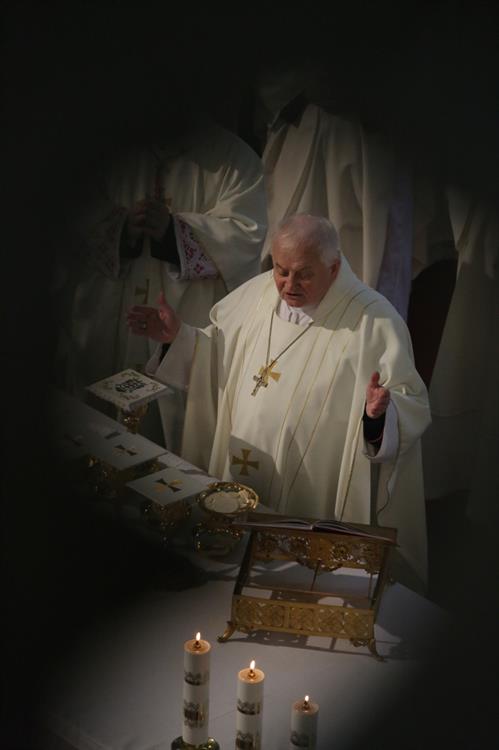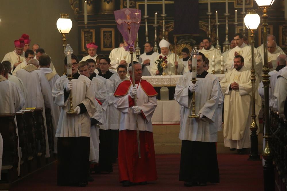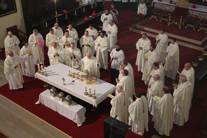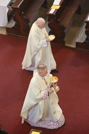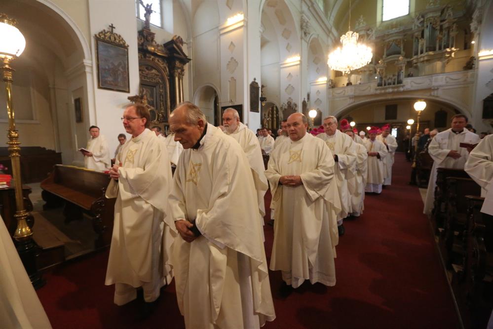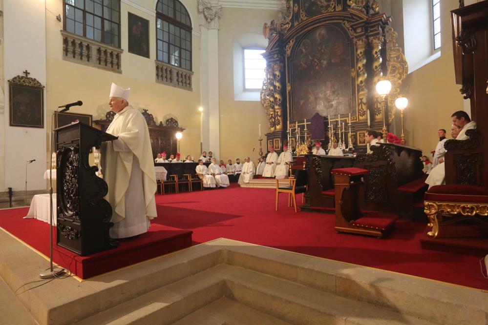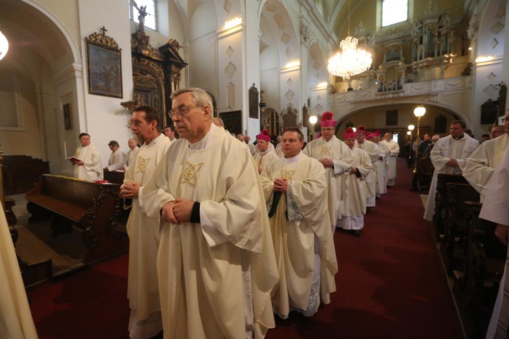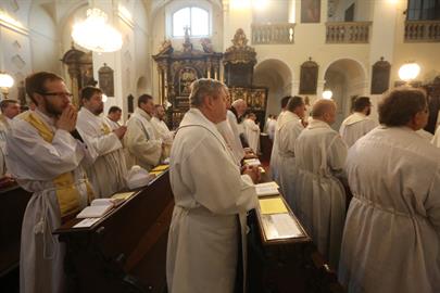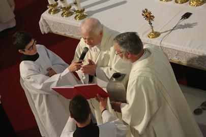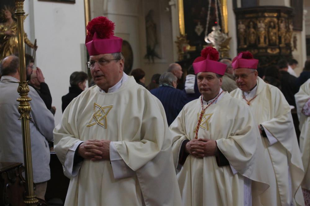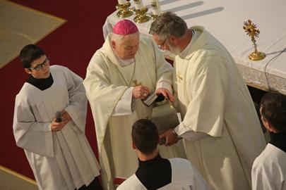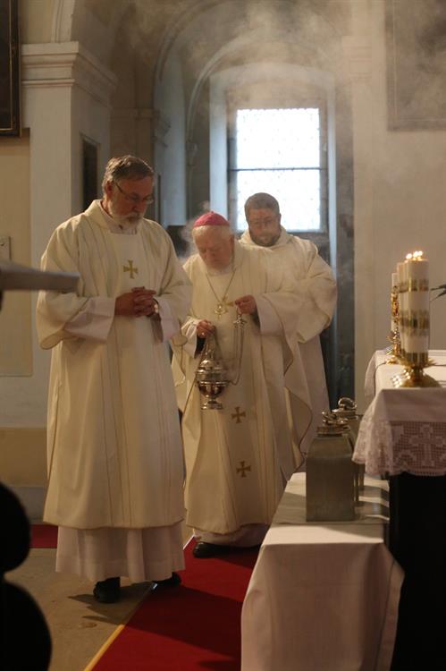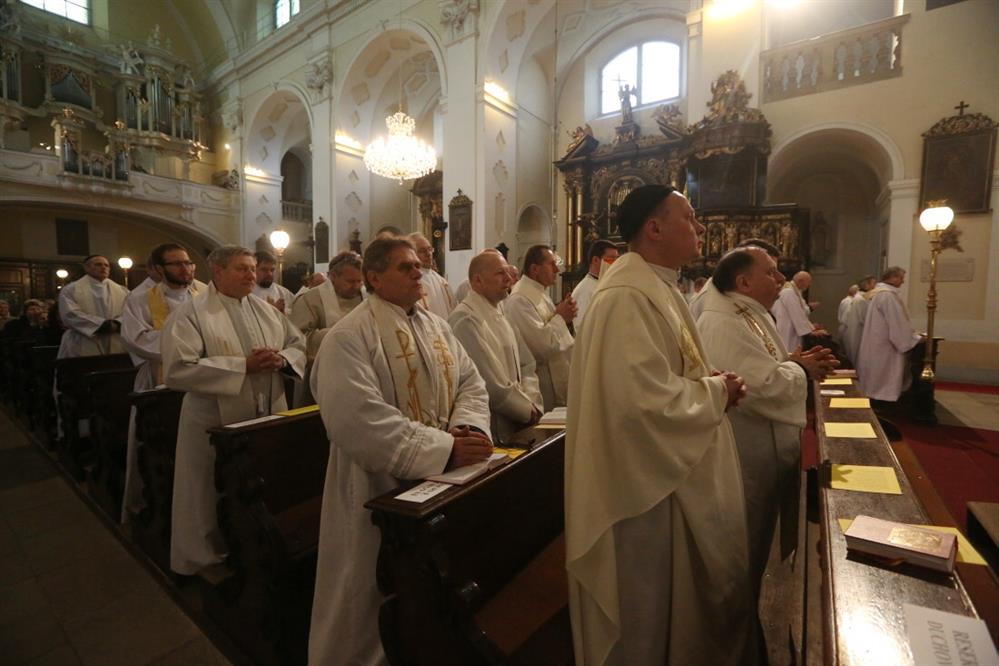 Missa chrismatis s emeritním světícím biskupem pražským Mons. Karlem Herbstem SDB, generálním vikářem litoměřické diecéze Mons. Martinem Davídkem, proboštem litoměřické katedrální kapituly P. Jiřím Hladíkem O.Cr. a kněžími litoměřické diecéze (slavnostní mše svatá s obnovením kněžských závazků a žehnáním posvátných olejů), Zelený čtvrtek, 13. duben 2017, katedrála sv. Štěpána, Litoměřice