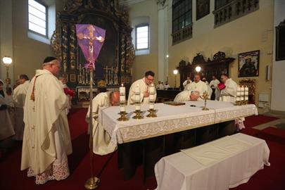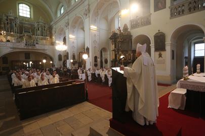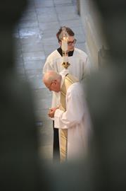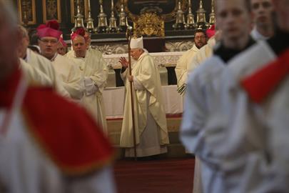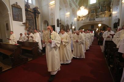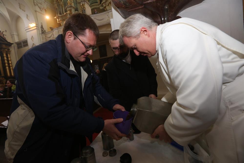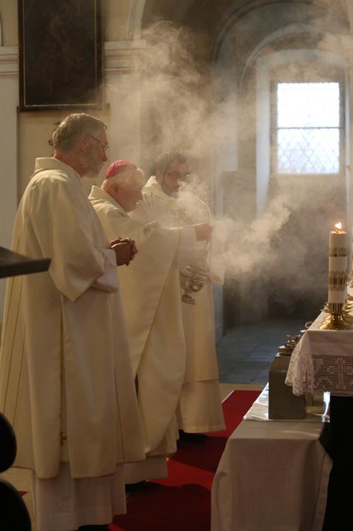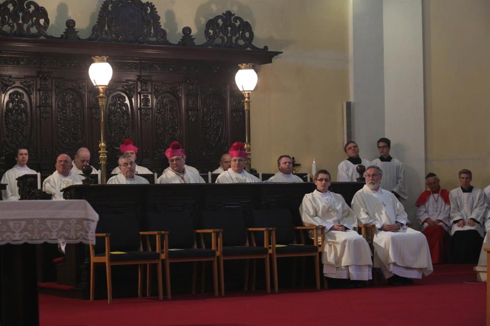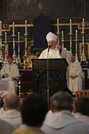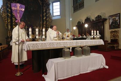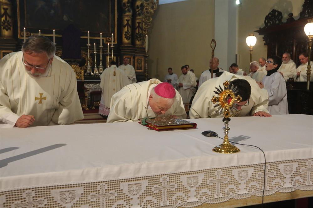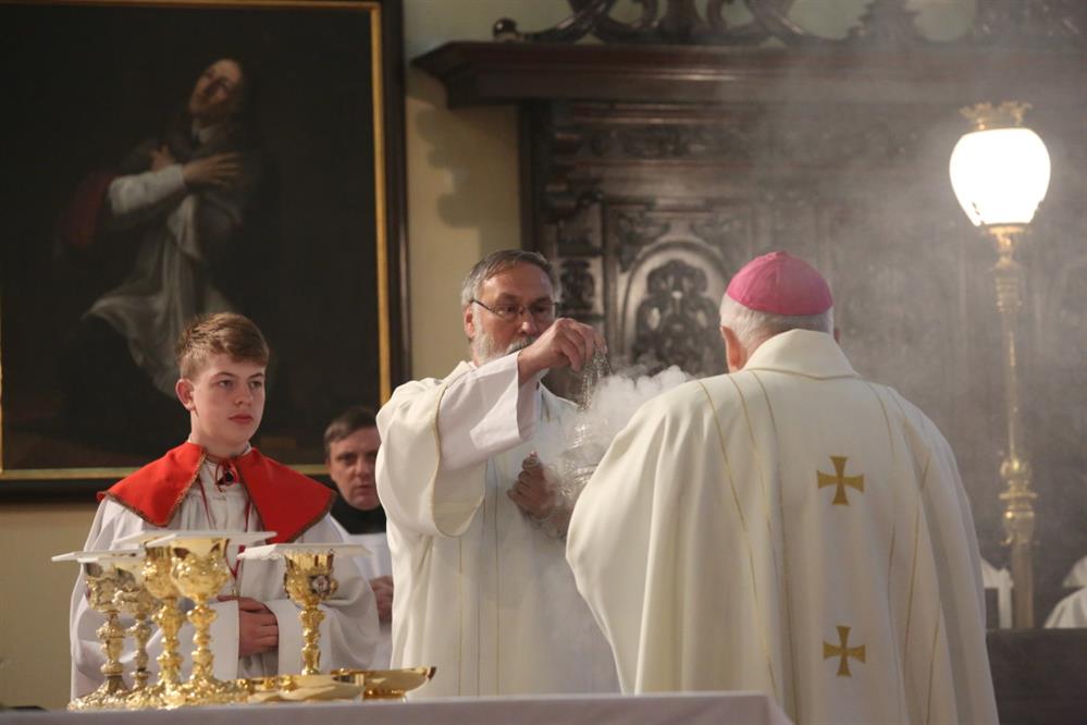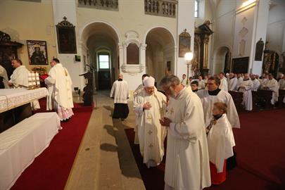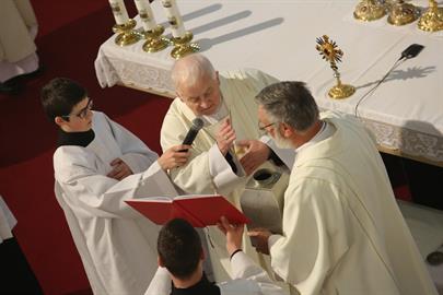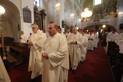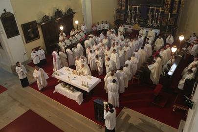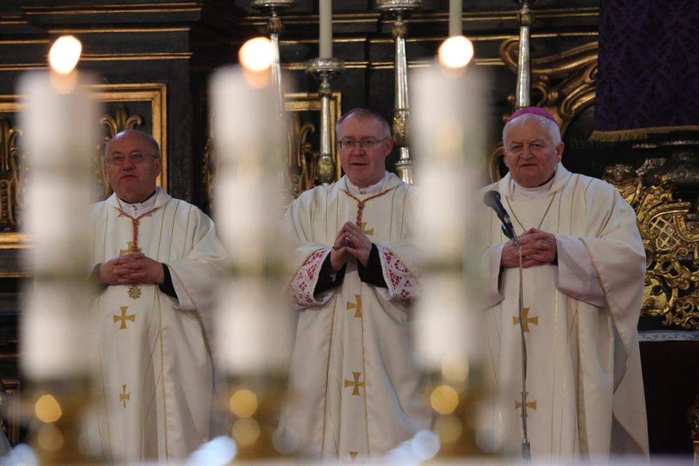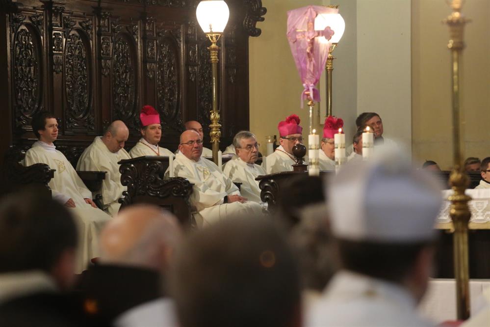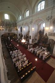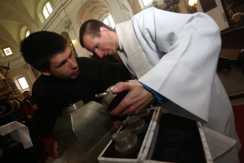 Missa chrismatis s emeritním světícím biskupem pražským Mons. Karlem Herbstem SDB, generálním vikářem litoměřické diecéze Mons. Martinem Davídkem, proboštem litoměřické katedrální kapituly P. Jiřím Hladíkem O.Cr. a kněžími litoměřické diecéze (slavnostní mše svatá s obnovením kněžských závazků a žehnáním posvátných olejů), Zelený čtvrtek, 13. duben 2017, katedrála sv. Štěpána, Litoměřice