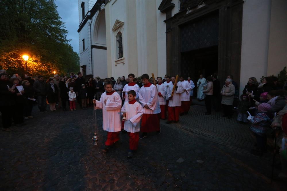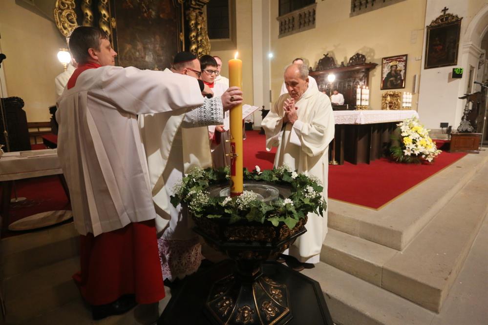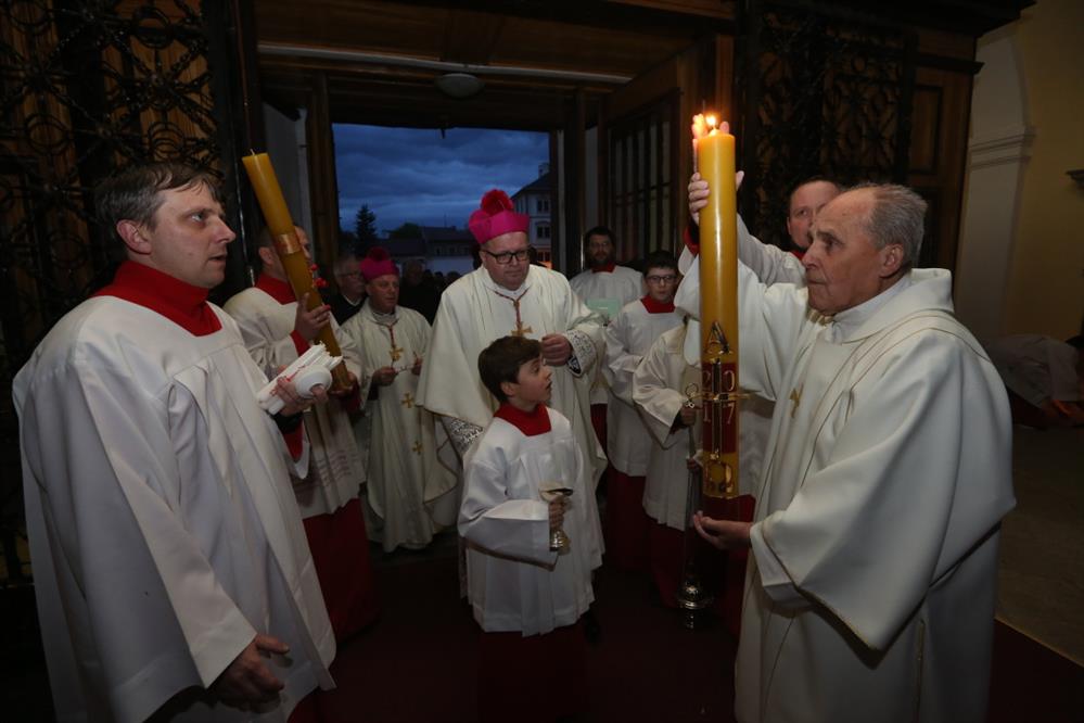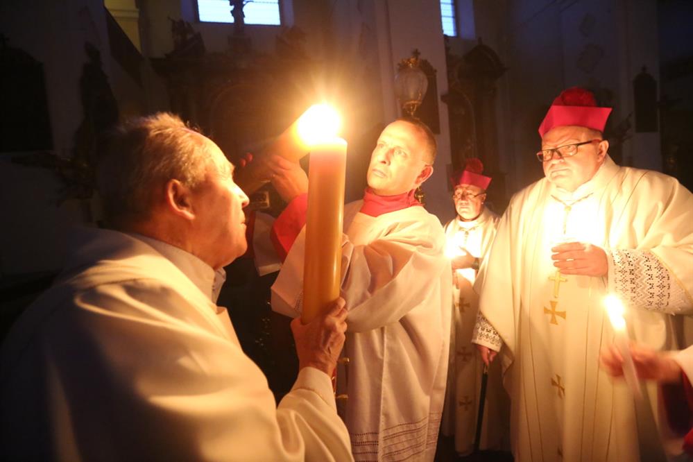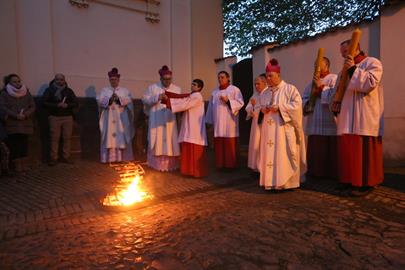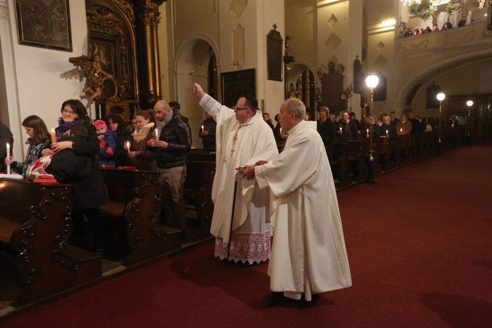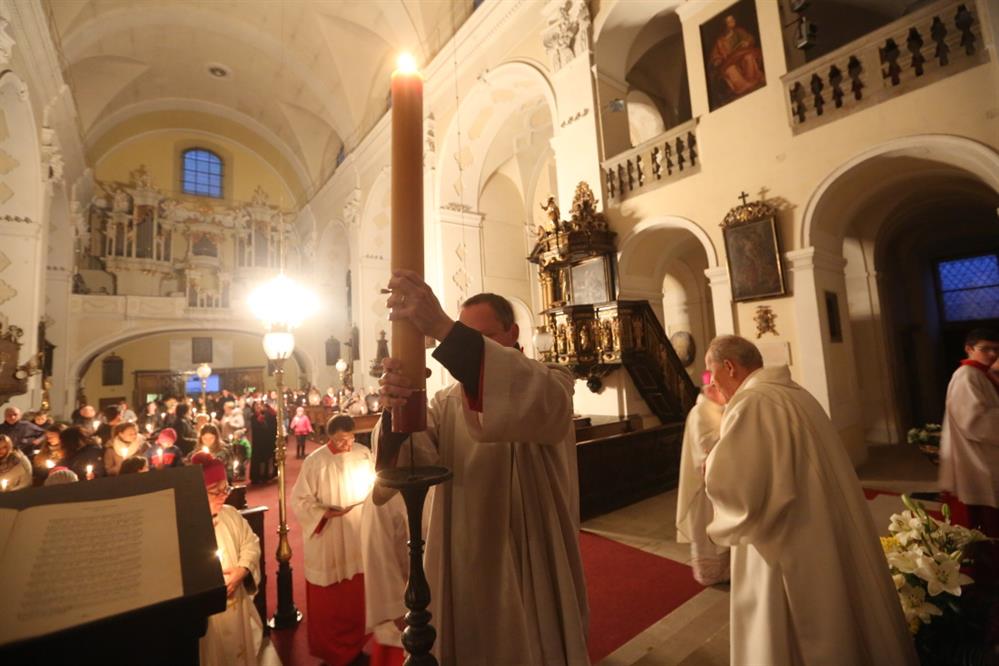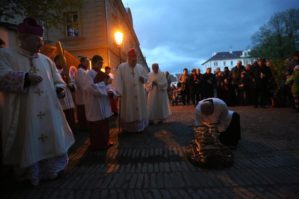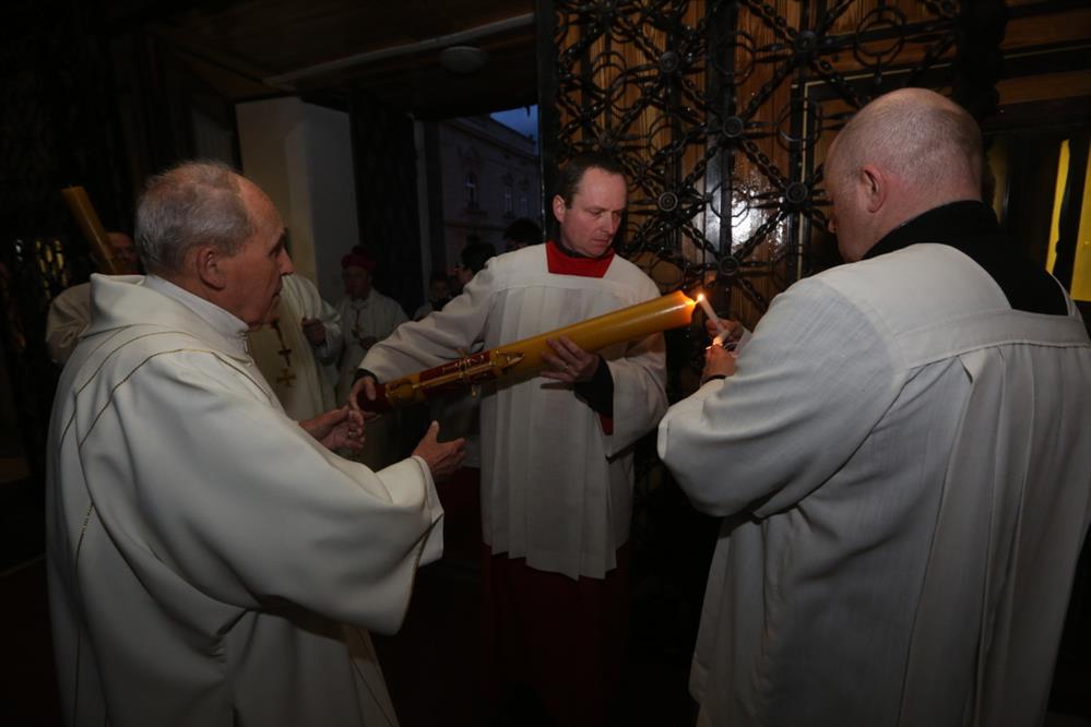 Bílá sobota, velikonoční vigilie (obřady velikonoční vigilie – slavnost světla, bohoslužba slova, vody a oběti) s proboštem litoměřické katedrální kapituly P. Jiřím Hladíkem O.Cr., generálním vikářem Mons. Martinem Davídkem a kapitulním kanovníkem a děkanem litoměřické městské farnosti R.D. Józefem Szeligou, 15. dubna 2017, katedrála sv. Štěpána, Litoměřice